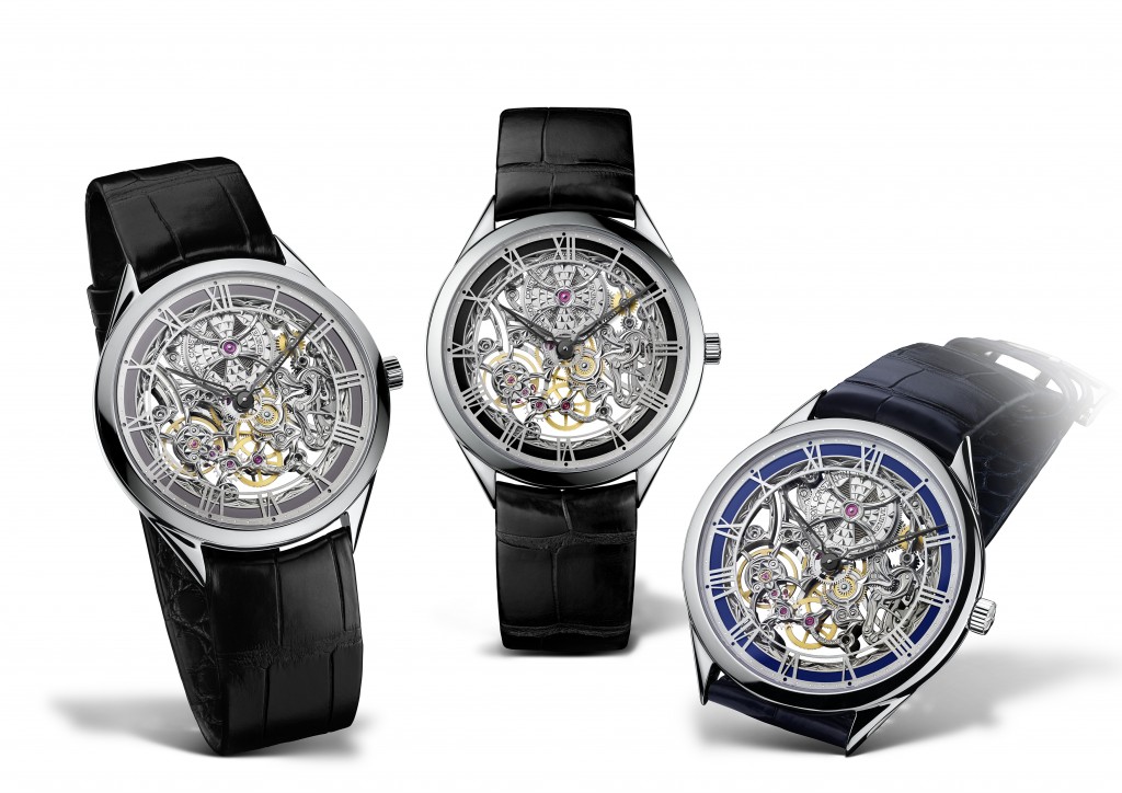 C’è anche una novità nell’approccio alla scheletratura, non più quella tradizionale a taglio verticale di superfici piane come ponti e platina, ma la ricerca di curve nel metallo per modificarne le luci dell’angolo vivo, nella foto sotto. Il primo movimento Vacheron Constantin squelette per un Tasca risale al 1924, ma sin dal XVIII secolo Jean Marc Vacheron aveva assottigliato un coq, il ponte del bilanciere. Gli orologi da polso squelette sono invece degli anni ’60; il metallo asportato dagli abilissimi incisori supera il 40% del peso. Qui pubblichiamo tre delle quattro novità 2014 con Punzone di Ginevra (la quarta rientra fra gli orologi gioiello con diamanti taglio baguette). La cassa in oro bianco ø 4o mm con fondello trasparente, ha una lunetta con anello in smalto Grand Feu nero, blu, grigio. Il movimento a carica manuale è il Calibro 4400SQ ideato e realizzato in house; comprende 127 elementi, ha 21 rubini.