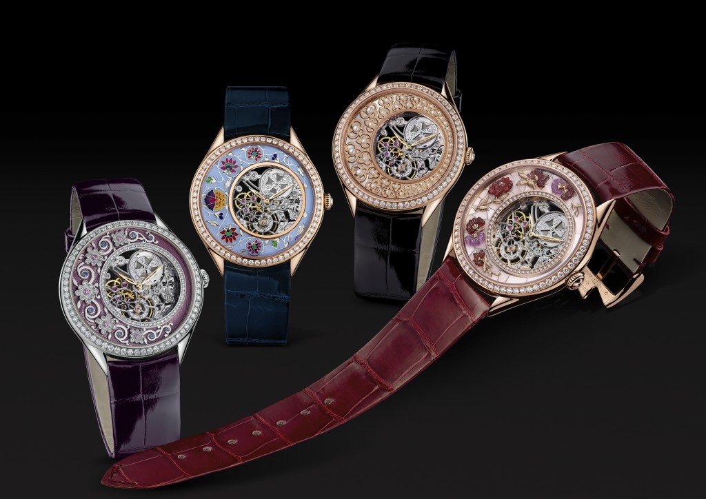 In questa collezione, foto sotto, gli smalti policromi coprono solo una parte del quadrante, lasciando ammirare da un’ampia finestra il movimento.Anche per questi modelli Vacheron Constantin non usa il termine squelettes, ma Ajourée, che ci fa pensare a corredi ricamati con gli orli à jour. Il movimento Calibro 1003SQ ideato e realizzato in house, è un 9”’ 1/4 a carica manuale, ha 117 componenti, 18.000 A/h e 18 rubini.