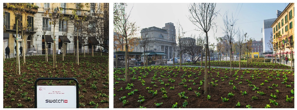 Non molto distante, nella cerchia dei bastioni, a Porta Venezia, Swatch ha mantenuto le promesse green fatte agli acquirenti di un orologio Swatch a Expo Milano: 5100 alberi sono stati messi a dimora in Kenia per sostenere la micro-imprenditorialità locale del commercio e della lavorazione della frutta, mentre 51 (chiaro riferimento al System51) sono stati piantati oggi in due aiuole di Porta Venezia, insieme a piantine di edera.