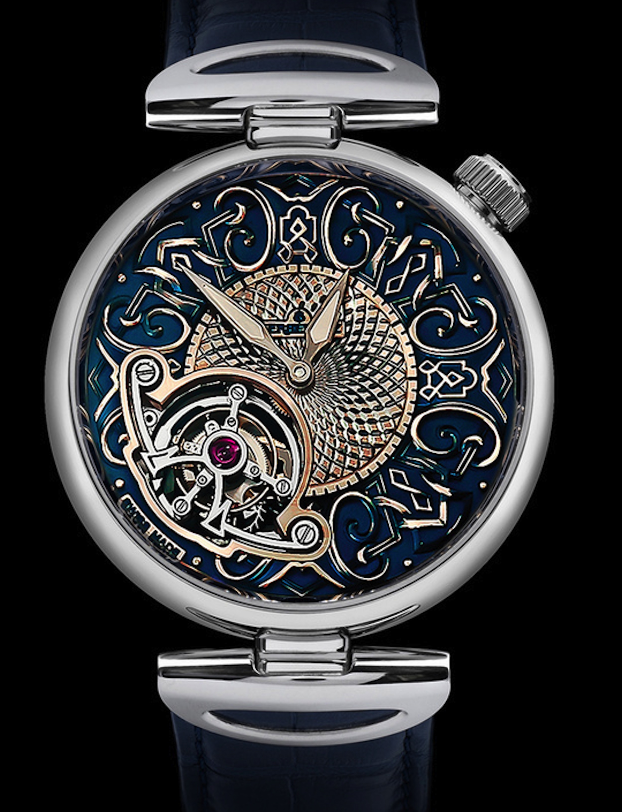 Quadrante e movimento a carica manuale sono ideati, realizzatie decorati da Kerbedanz e TechnoTime, un binomio che ha dato ottimi risultati. Il movimento con scappamento a tourbillon, KRB-01 ha 27 rubini, 28.000 A/h e un doppio bariletto che garantisce 120 ore di carica, visibile dal fondello mostra incisioni e colori del Marchio. Particolare la posizione della gabbia del tourbillon tra le 7 e le 8 in corrispondenza con l’asse di carica tra l’1 e le 2, che simula il levar del sole visto dall’emisfero nord. La cassa in oro bianco ø 43mm, disegnata e realizzata da Kerbedanz ha la corona a nord; sul cinturino in alligatore fibbia personalizzata; il quadrante su tre strati, ideato e decorato artigianalmente in house, riprende sull’oro rosa trattato galvanicamente blu, il motivo del sole. L’esemplare è in edizione numerata e limitata a 41 esemplari.