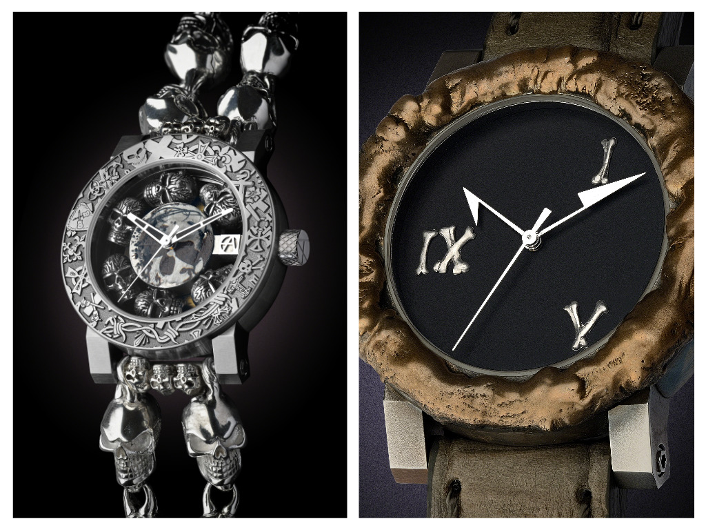 Nella collezione di orologi ArtyA Son of Sound Skull & Bones l’eclettico artista ha ideato teschi e ossa (forse meno intrigante dire ossi, ma andremmo a provocare gli animalisti). L’automatico, ø 47 mm, è stato realizzato con un teschio inciso al centro del quadrante e sculture sulla lunetta e sul bracciale; l’argento inciso o scolpito era una colorazione perfetta per chi poteva permettersi un pezzo unico il cui costo, secondo i “rumours”, si aggirava fra 10 e 20mila franchi svizzeri. A Baselworld 2015 un modello S&B è stato esposto in acciaio, aggiungendo ulteriore difficoltà nella lavorazione e ancora una volta l’attenzione si è suddivisa equamente fra orologio e bracciale. La proposta più recente per un pezzo unico (1/1) sceglie invece una lunetta in bronzo con sculture di ossa e altri simboli cari a Arpa, un quadrante con solo tre indici e un cinturino in pelle; ridotto il prezzo che si aggira sui settemila franchi e che ne fa comunque un pezzo per una piccola élite, che alla passione per gli orologi, aggiunge anche un portafoglio ben fornito.