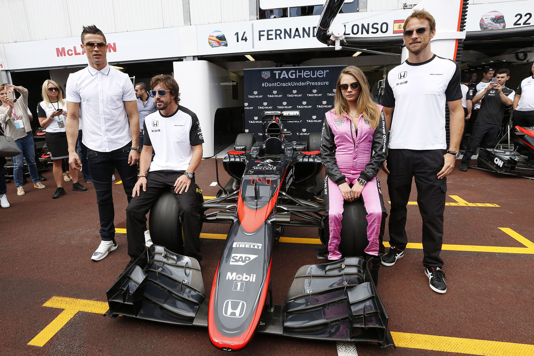 Monte Carlo, Monaco: Cristiano Ronaldo, Fernando Alonso, McLaren, Cara Delevigne and Jenson Button, McLaren, pose on the McLaren. N