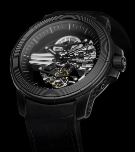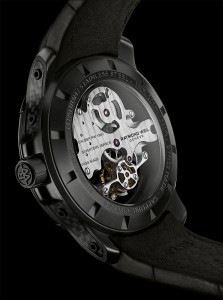 Il movimento meccanico a carica manuale, è scheletrato creando un piacevole contrasto fra la leggerezza dei ruotismi e le dimensioni della cassa; questa è in acciaio e titanio, trattata PVD nero, ø 46 mm, sub a 20 atm. e ha il fondo in vetro zaffiro. Speciale anche la confezione in legno pregiato con l’orologio posato sulla cordiera dello strumento.