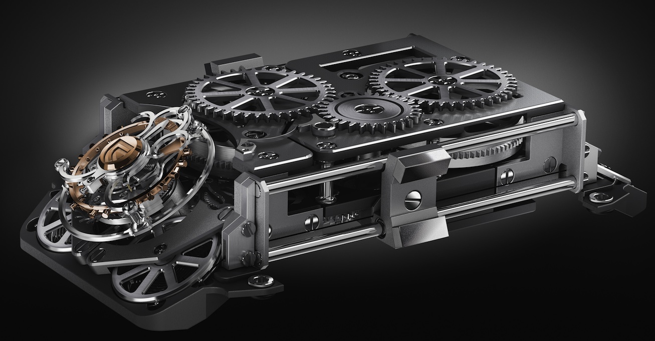 Il movimento riunisce 619 elementi, i rubini sono 64; due i bariletti, uno per il tourbillon l’altro per ore e minuti con un sistema di alimentazione magnetica: due minuscole sfere leggere in acciaio, non collegate meccanicamente al movimento, si muovono in tubi a griglia collocati ai lati della carrure e trainati da due “carrelli” magnetizzati tirati da fili in nanofibre e gel di polietilene. Il diametro di questi fili, vere micropulegge, è inferiore a un capello, ø quattro centesimi di millimetro; resistenza alla trazione: un chilo. La tecnologia brevettata è stata sviluppata con l’Haute Ecole d’Ingénierie de Gestion del Cantone di Vaud a Yverdon-le-Bains (HEIG-VD).