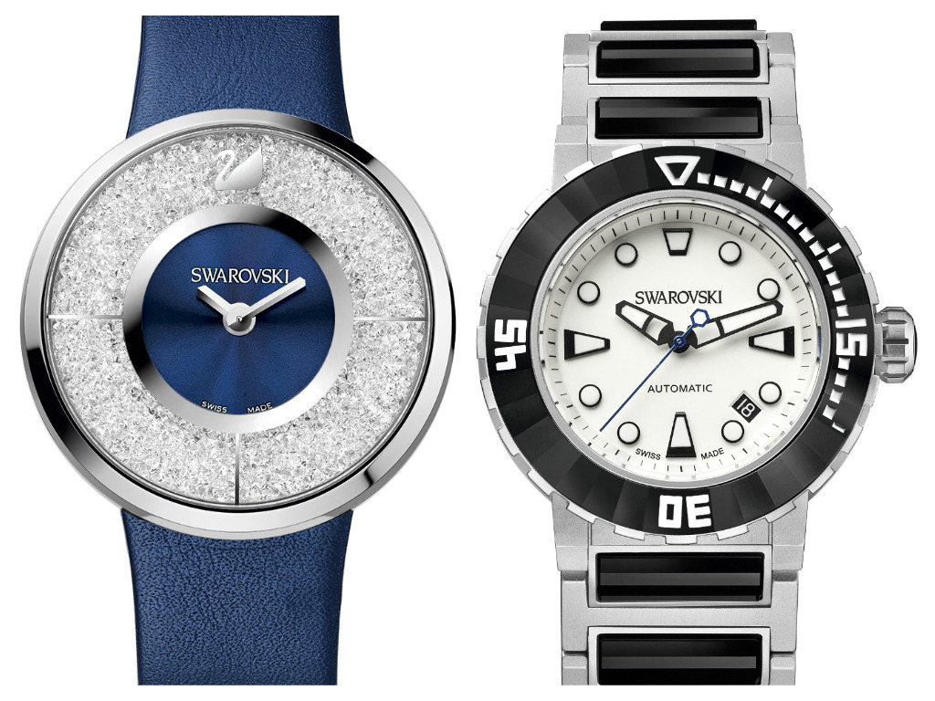 Sono cinque le collezioni femminili presentate da Swarovski a Baselworld 2015, na agli scintillanti modelli Lady, nella foto il Cristalline al quarzo con cinturino blu, ma esiste anche in altri colori molto natalizi, con il quadrante decorato da centinaia di cristalli mentre per i polsi maschili ci sono gli Octea Abyssal con movimento automatico e lunetta girevole unidirezionale in ceramica nera sfaccettata.