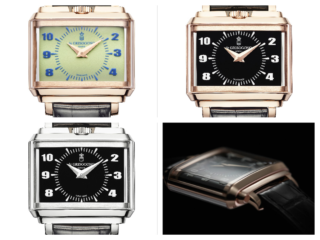 Ma torniamo al New Retro disponibile in 4 versioni in oro rosa o bianco, cassa mm 50×44, spessore 12 mm; sul quadrante nero, crema, verde sfumato (un colore molto indovinato) lo stemma di De Grisogono; il movimento automatico ha la massa oscillante in oro annerito e con decorazioni, le A/h sono 28.800; sul cinturino in alligatore a squame larghe, tripla fibbia deployante in oro. Una quinta versione, con le medesime caratteristiche, è invece in acciaio trattato PVD nero.