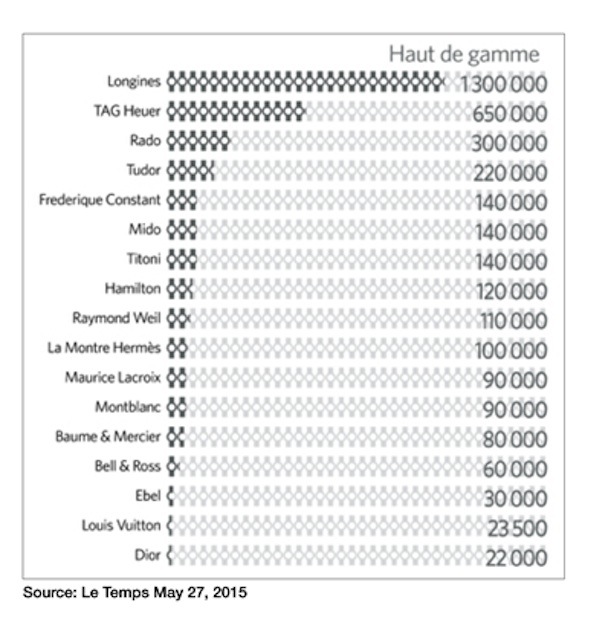 Alla fine di maggio su Le Temps, importante giornale elvetico, è apparsa una tabella a corredo di un articolo di Valerie Gogniat e Servan Peca, che suddivideva gli orologi svizzeri in 4 famiglie secondo il prezzo di vendita: “entré de gamme (0 à 600 francs), milieu de gamme (600 à 1500), haut de gamme (1500 à 8000) et luxe (8000 et plus)”.