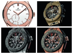 il nuovo Hublot CLassic Fusion Ultra-Thin, il Magic Gold e, sotto, le due versioni del Big Bang Ferrari Carbon con lunetta incrostata d’oro o titanio e movimento Unicum All Black