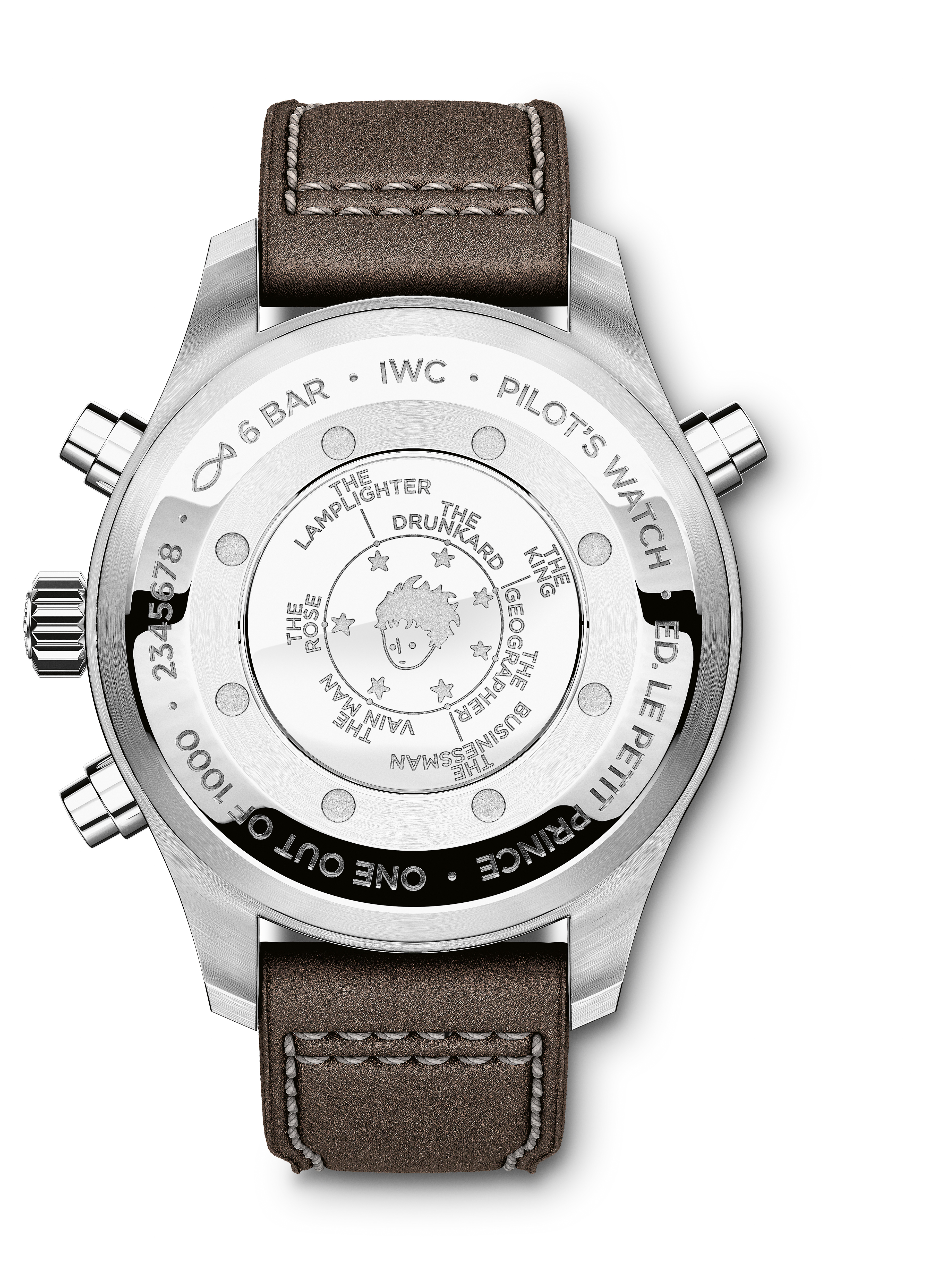 Questa volta il Big Pilot’s ha il quadrante blu, per altro già visto tra gli IWC, ma che qui sembra davvero un cielo stellato. Oltre alla normale indicazione del giorno della settimana infatti, il quadrante è decorato con stelle, l’una diversa dall’altra, che si illuminano con sequenze alternate. Queste stelle sono incise anche sul fondello a ricordo dei personaggi descritti nel libro (il re, il vanitoso, l’ubriacone, l’uomo d’affari, il lampionaio, il geografo e infine la rosa dalla quale il viaggiatore farà ritorno). Chi ha letto il libro sa che furono proprio sette i pianeti visitati dal Piccolo Principe nel suo viaggio avventuroso alla ricerca di un amico.