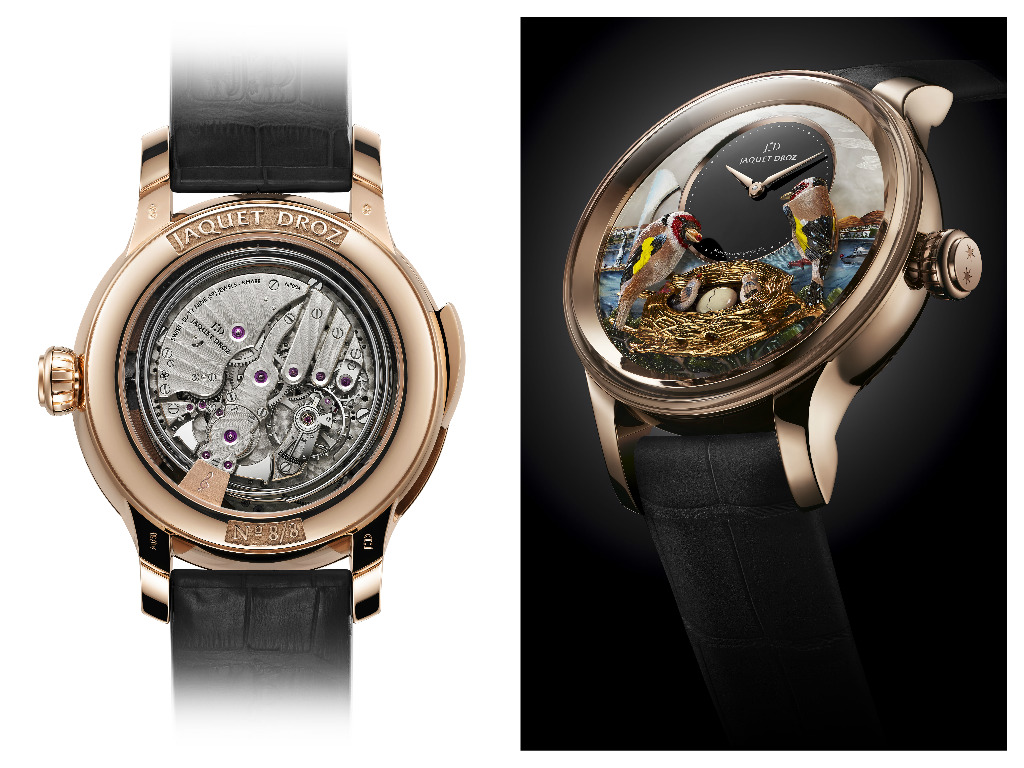 2015 il Singing Bird Repetear dedicato a Ginevra, sul quadrante lo sfondo del lago con il famoso getto d’acqua, le montagne ginevrine e, sull’Ile de Rousseau, i cardellini: 8 le loro animazioni, gli ucelli nutrono i piccoli, le ali si muovono, l’acqua scorre, l’uovo si schiude