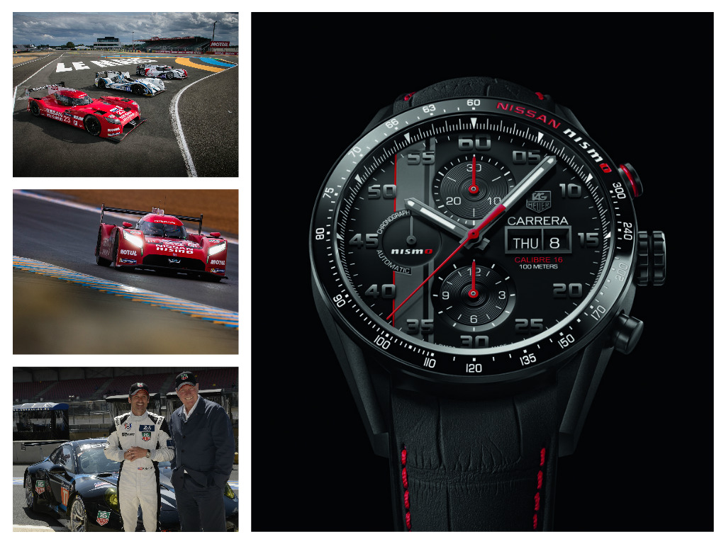 24 h Le Mans and TAG Heuer together since many years, while Nissan is coming back with the new GT-R-LM NISMO, and the watch is chronograph day-date Carrera Caliber 16.
