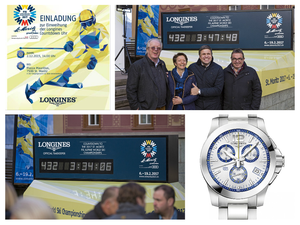Ieri a St.Moritz la Marca di St.Imier e la località sciistica hanno presentato il count-down per Mondiali di sci del 2017 che per la quinta volta si svolgeranno sulle nevi dell’Engadina che li ha già ospitati nel 1934, 1948, 1974 e 2003.