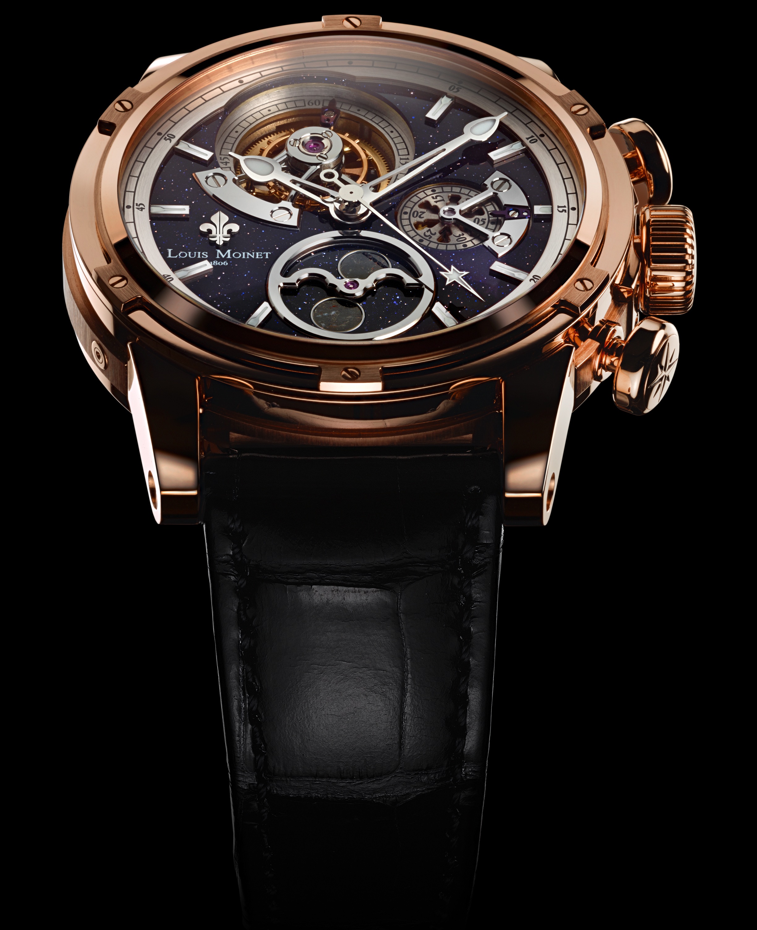 Il nuovo astronomico realizzato a Sainte Blaise da Les Ateliers Louis Moinet, offre più di una complicazione: a parte le fasi di luna e le lancette luminescenti (quella centrale del cronografo mostra una stella come nella pendola di Moinet del 1825), la cronografia ha la ruota a colonne e, ciliegina ormai indispensabile nell’alta orologeria, lo scappamento è a tourbillon con ponti ricurvi e una gabbia generosa.