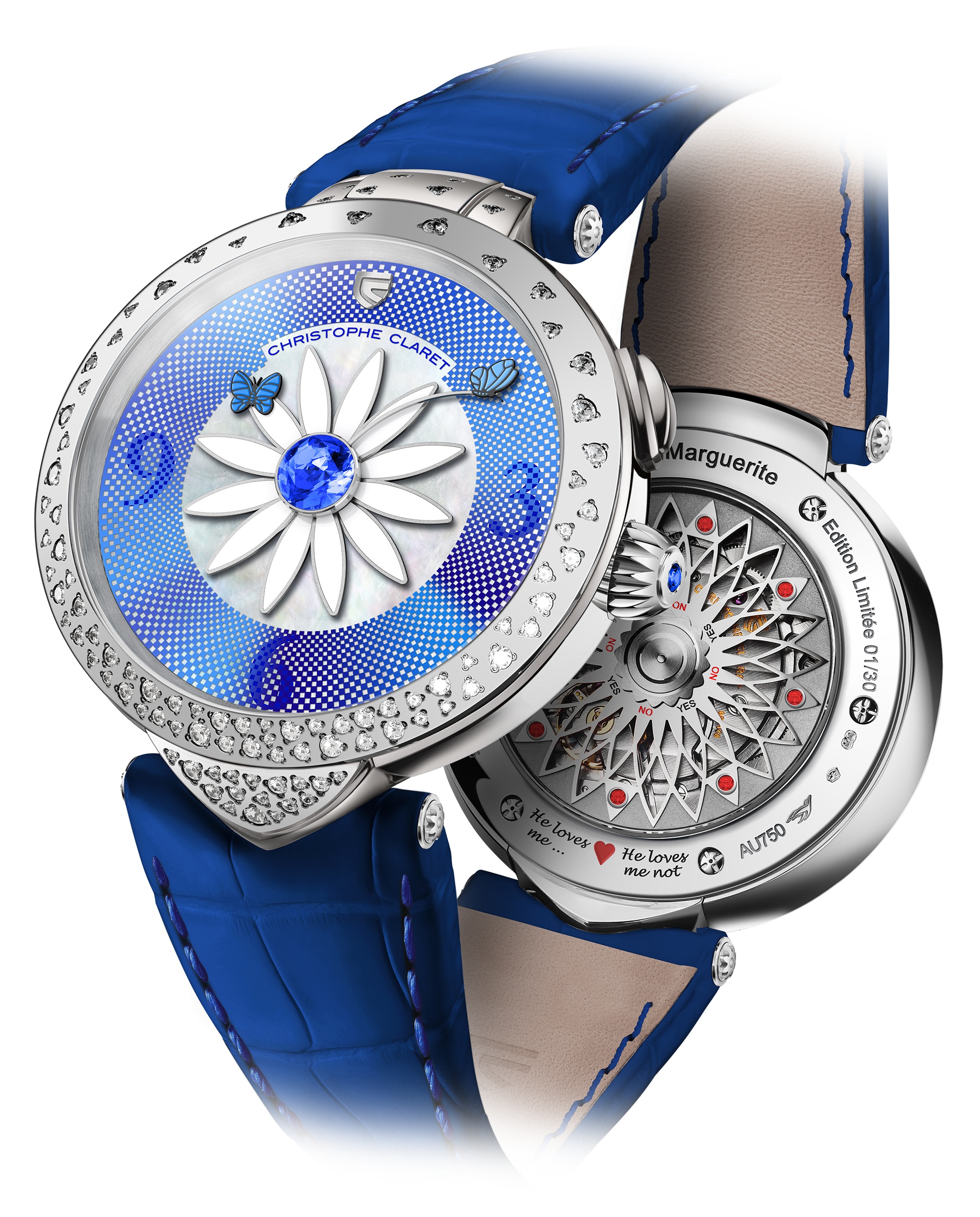 La novità è rappresentata da due farfalle grigio antracite, quella femminile, più scura, è su un petalo del fiore e sul quadrante indica le ore, quella maschile più chiara, sulla punta di uno stelo, su un pistillo in rubini o zaffiri, i minuti. Le complicazioni non si esauriscono qui, infatti premendo il pulsante a ore due i numeri arabi 3, 6, 9 scompaiono e si legge la frase “il m’aime passionement”, il gioco ottico è ottenuto sovrapponendo due dischi in vetro zaffiro, quello superiore metallizzato con un mosaico di quadrati trasparenti ruota sopra l’altro che è fisso, in madreperla, ricoperto da un altro mosaico in vernice nera o blu stampata a tampone, dove appaiono testo e numeri. Rilasciando la pressione ricompaiono subito le ore.