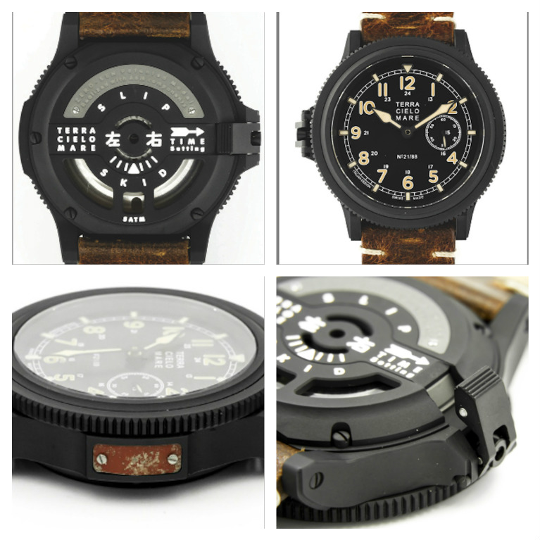 Con l’Associazione Ali Storiche la Marca lombarda ha recuperato un pezzetto di alluminio di una carlinga dove era impressa la bandiera giapponese e la stessa immagine è sulla carrure del segnatempo. Le analogie non si fermano qui, sul quadrante indicazione 12-24h, sul fondello l’inclinometro Slip e Skid, che sugli aerei consentiva al pilota di controllare la virata, ha ideogrammi giapponesi.