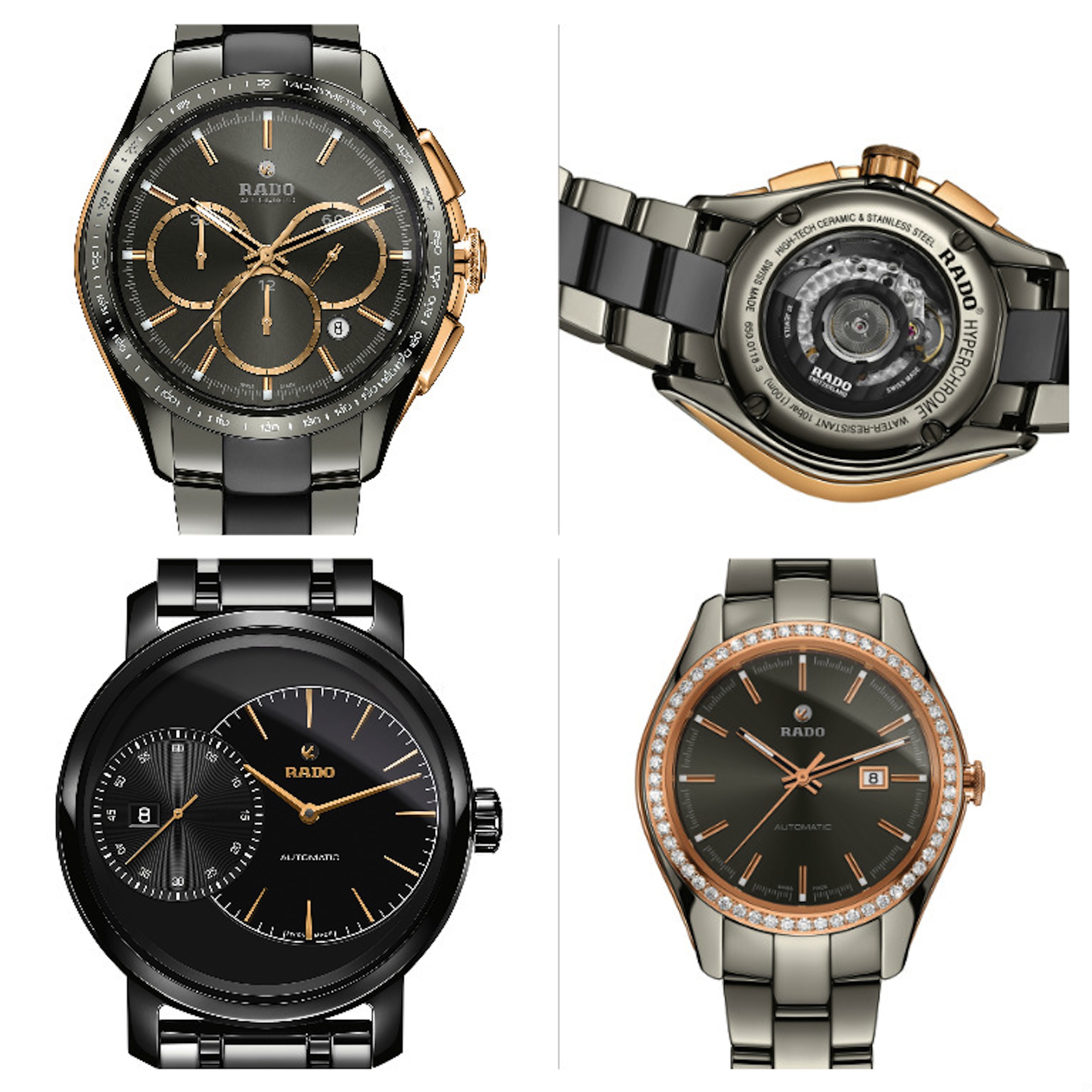 Di grande successo è stata la ceramica nera brillante nel Rado Integral, poi gli studi e le ricerche sui materiali hanno portato ad un colore bianco intenso e a un elegante grigio. Finiture opache sono state realizzate per creare suggestivi contrasti così come i diamanti, sino ad arrivare ad un’altra prima Rado: la ceramica plasma, con una finitura che la fa assomigliare al metallo mentre è solo ceramica al 100%.