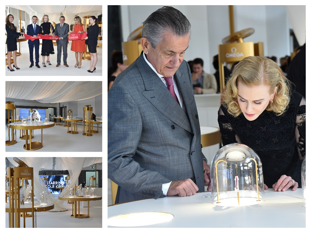Il presidente di Omega Stephen Urquhart illustra a Nicole Kidman uno dei modelli esposti, a lato il taglio del nastro o e l’allestimento.