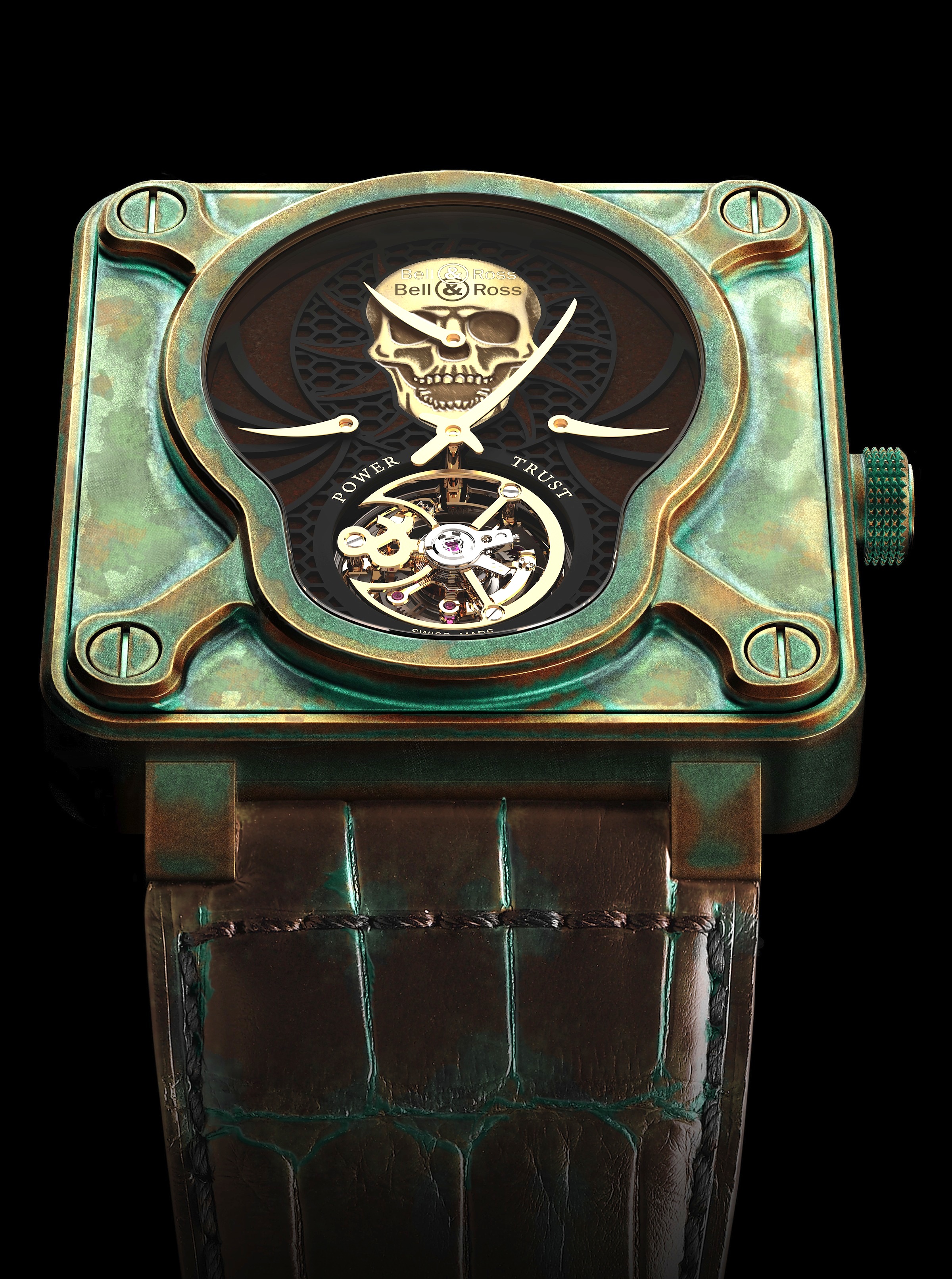 Così rispettiamo il diritto di cronaca pensando che probabilmente, nel mondo orologiero, sono numerosi gli appassionati dei “memento mori” intesi come talismano. Opinioni a parte, Bell&Ross ha scelto il bronzo per il suo Skull Tourbillon B&R01 (fondo in titanio a vista) con lancette che sembrano antiche armi o le ossa sulle bandiere dei pirati; l’incisione del teschio è in oro, dal naso parte la lancetta delle ore, dal centro del quadrante quella dei minuti come negli orologi regulateur. Il movimento. meccanico a carica manuale e con il logo B&R ha una carica di 5 giorni indicata sul quadrante; fu ideato da BNB Concept, gruppo di orologiai specializzati in complicazioni, poi costretti a chiudere e diversi maestri passarono sotto Hublot, che a quanto si disse allora, aveva già preparato lo spazio per accogliere persone e macchinari. Tornando all’orologio la cassa quadrata è un omaggio ai primi B&R misura mm 46 e si riallaccia allo stile militare; insomma un orologio “only for the brave”, che si svela all’apertura della confezione, sotto una protezione sferica in vetro sferico.