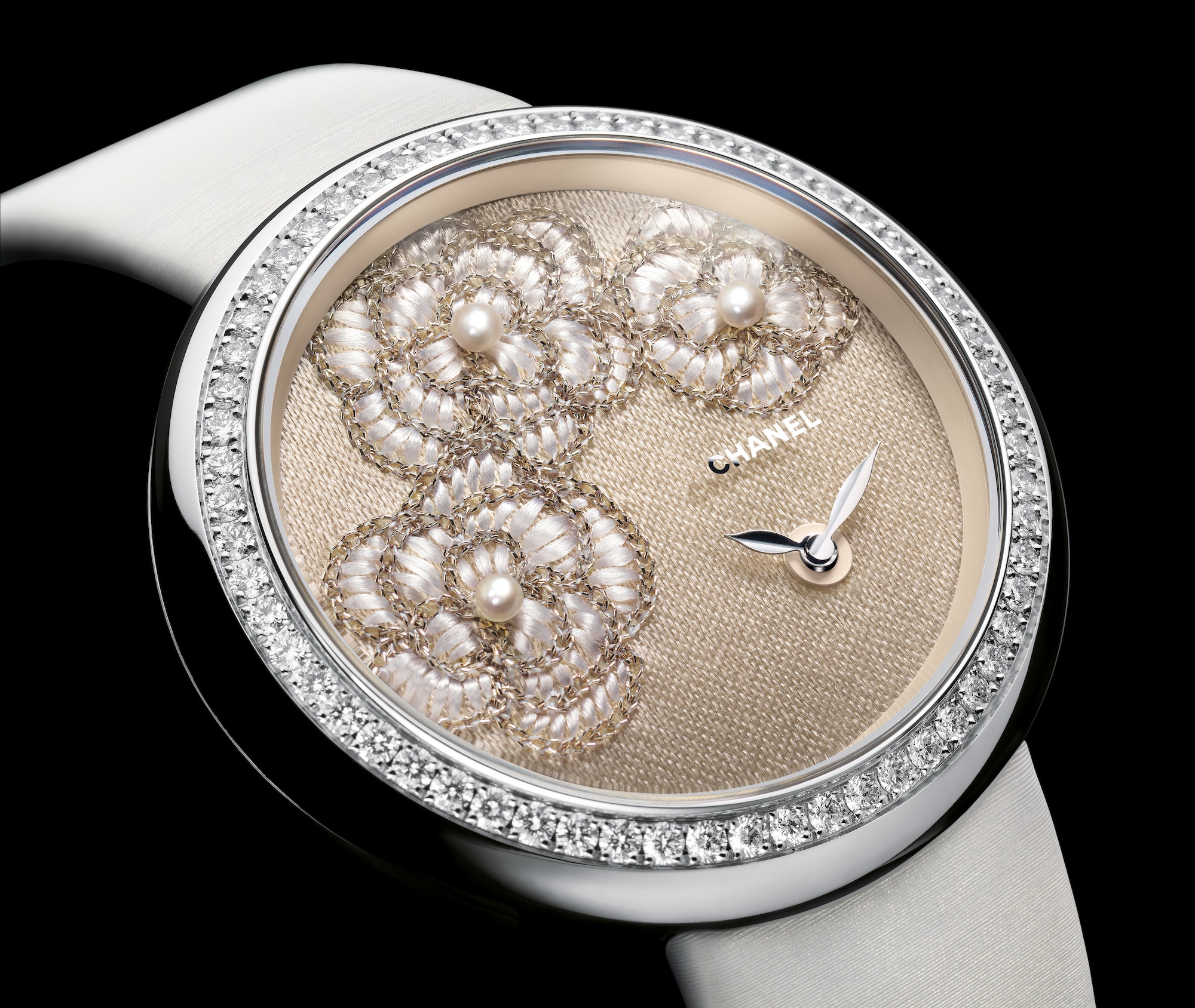 Sul quadrante di questo pezzo unico realizzato in Svizzera, ha scelto, nella collezione Mademoiselle Privée, un quadrante che sicuramente sarebbe piaciuto a M.lle Cocò: la famosa Maison Lesage ha ricamato sulla seta beige il fiore prefierito da Cocò, la camelia, interpretandola con fili d’oro, fili metallici e tre perle naturali. La cassa in oro bianco, ø 37,5 mm, incastona 70 brillanti, 80 sono sulla fibbia d’oro mentre l’eleganza del modello si completa con un cinturino in satin bianco; lancette in oro bianco e movimento al quarzo decentrato a ore 5 per creare un elemento simmetrico, ma che nello stesso tempo non disturba l’armonia del ricamo.