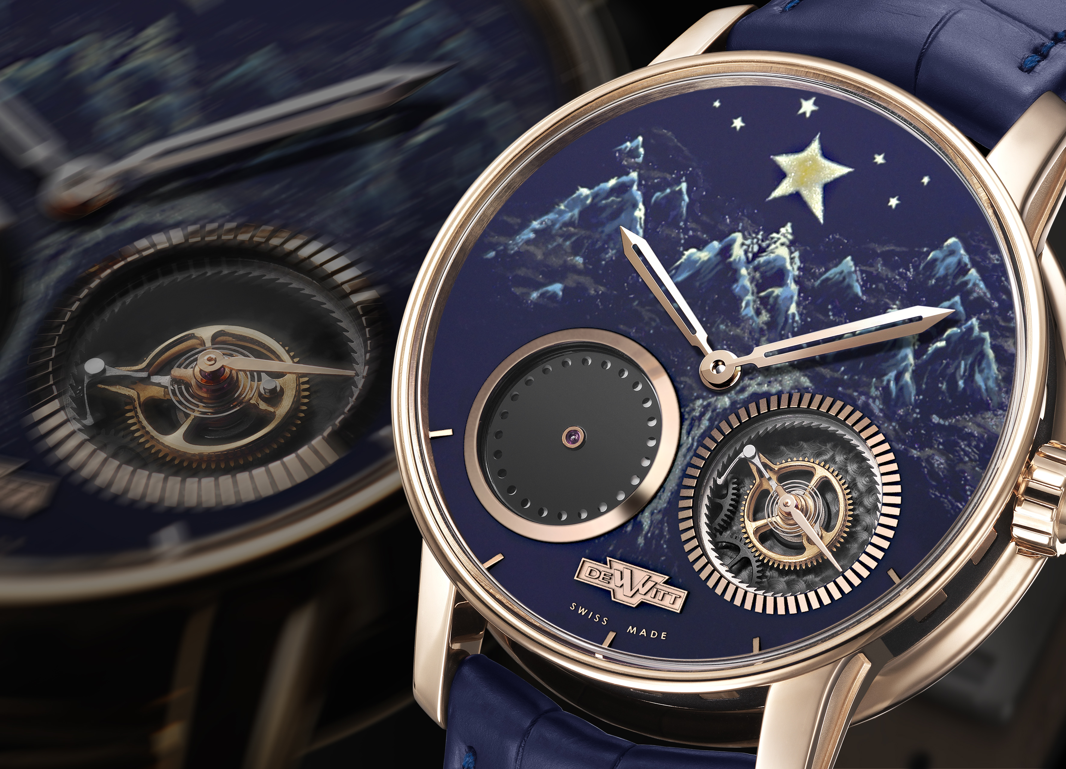 For Only Watch De Witt offers a self-winding patented watch measuring real and virtual time, on the dial mountains and stars men are looking for.