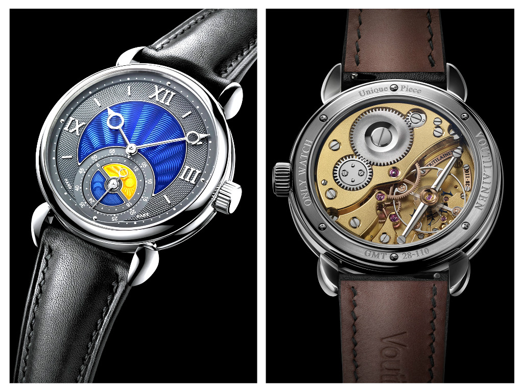 Premiato anche al GPHG per le idee e l’accuratezza degli esemplari, ha realizzato per l’asta benefica di quest’anno un orologio che sembra semplice, ma che possiede tutti i tratti dell’alta orologeria. La piccola Manifattura produce un numero limitato di esemplari fatti in house, acquistando solo alcuni componenti per i movimenti, come rubini o spirali. Generalmente le casse sono in metallo prezioso, ma questo GMT è il primo e unico con la cassa in acciaio, ø 38 mm. Corona, indici applicati e fibbia del cinturino sono però in oro bianco; è disegnato e realizzato nell’atelier anche il quadrante in argento con la parte centrale in oro bianco smaltato Grand Feu, alle 6 indica il giorno e la notte (da notare i colori sfumati delle due sezioni). La funzione GMT è integrata nel movimento, ad ogni pressione della corona l’ora avanza sul disco delle 24h. Il movimento (21 rubini e 18.000 A/h) ha un nuovo scappamento con due ruote e impulso diretto, le ruote sono in oro rosa, il bilanciere ha un diametro di mm 13,60 e spirale Breguet/Grossmann. Il finisagge artigianale dei componenti è quello della migliore tradizione.