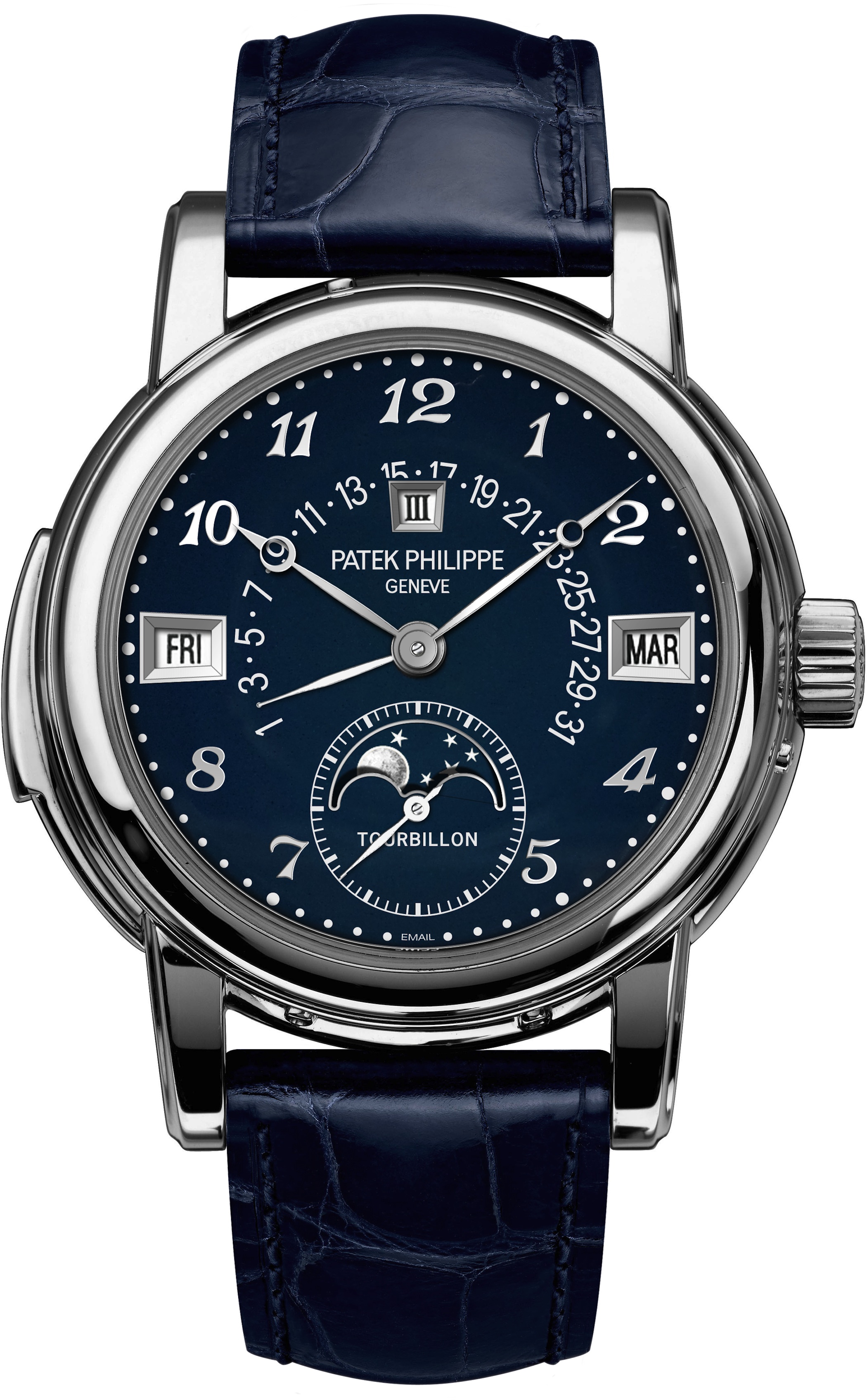 Il Calibro R TO 27 PS QR è a carica manuale e il Quantième Perpetuel indica giorno, mese, anno e quadriennio dalle finestrelle, i piccoli secondi sono alle 6 e ci sono le fasi di luna. Un altro particolare speciale è dato dal quadrante in smalto blu su oro e con indici Breguet applicati in oro; il blu che in questi ultimi tempi è molto richiesto, si sposa perfettamente al freddo colore dell’acciaio quasi a voler ricordare i cromatismi della volta celeste, mentre si riallaccia al passato, il diametro della cassa in stile Calatrava: solo mm 36,8, una misura che negli orologi da polso veniva usata per i modelli maschili del secolo scorso e che oggi, paragonata ai 40/45 mm di orologi non solo sportivi, la rende estremamente elegante e raffinata. Il segnatempo è fornito con due fondi, uno in vetro zaffiro e uno pieno. Il cinturino in alligatore blu è cucito a mano, il colore si coordina a quello del quadrante, la fibbia è deployante.