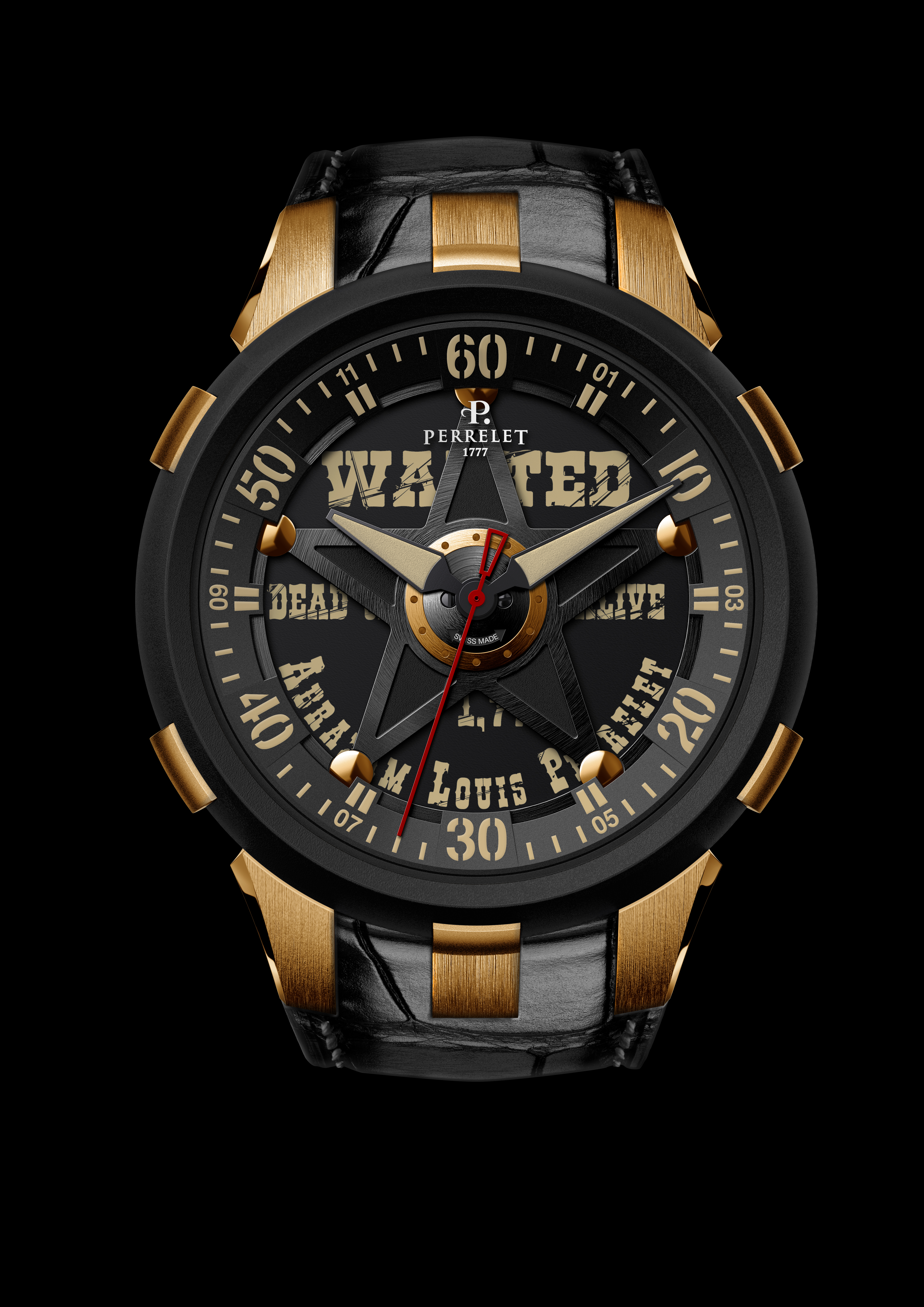 La Marca che porta il nome di Abraham-Louis Perrelet, pioniere del movimento automatico nel XVIII secolo, ha realizzato una versione speciale del suo Calibro P.331 realizzato in house e visibile dal fondello. La stella dello sceriffo ruotando svela anche una scritta divertente: wanted dead or alive. La cassa ø 48 mm è in acciaio, fondo e lunetta trattati black PVD, mentre la carrure è in oro rosa; dettagli dorati anche sul quadrante nero.