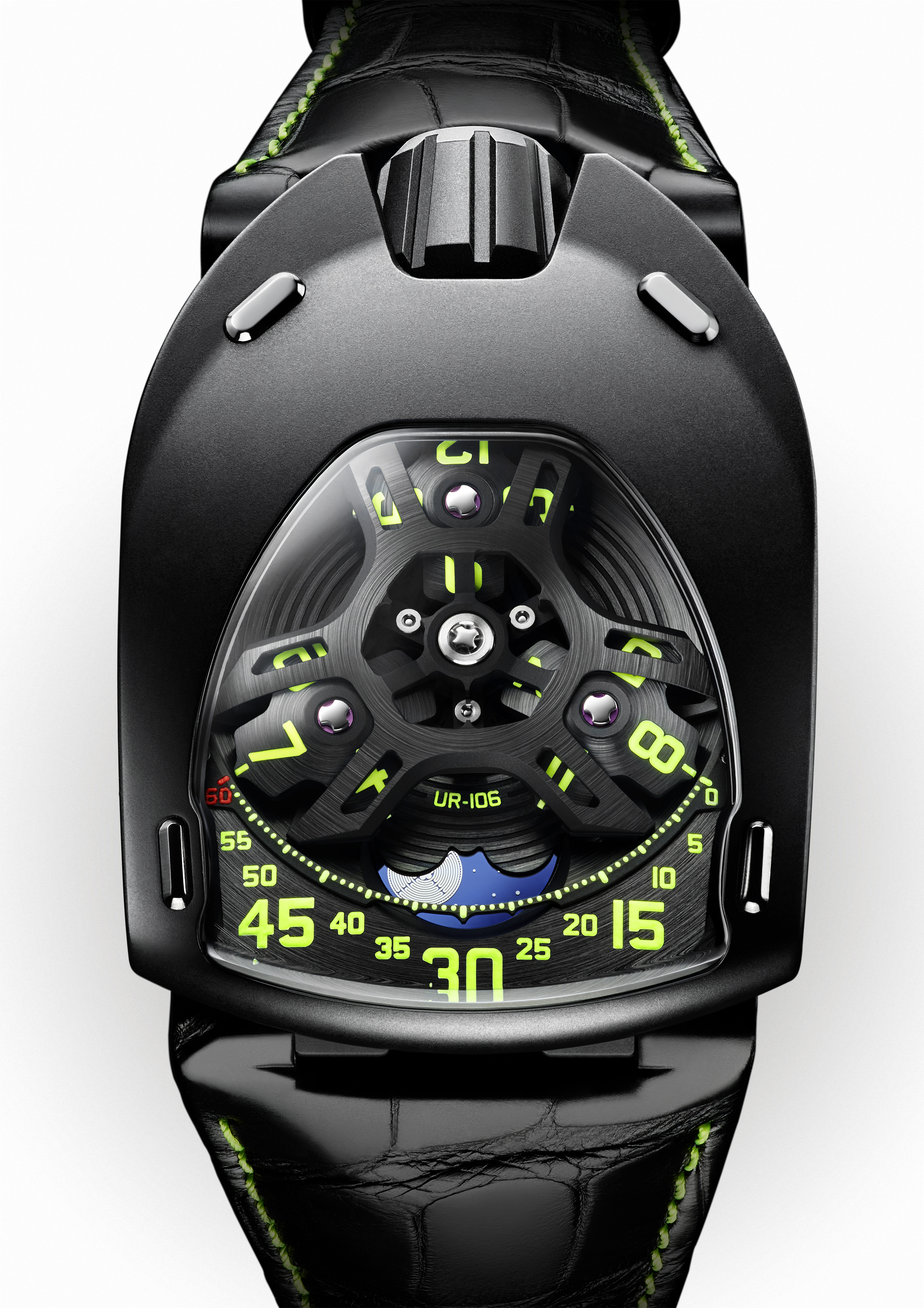 Felix Baumgartner e Martin Frey, dichiarando che questo appuntamento è irrinunciabile per chi voglia aiutare la ricerca.medica, hanno scelto un automatico con tre satelliti che completano le funzioni analogiche digitali dell’orologio mostrando anche le fasi di luna. Sotto il profilo tecnico l’UR-106 ha la cassa in titanio trattato black mentre la lunetta, sempre trattata black PVD, è in acciaio; il movimento è il Calibro automatico 6-01, A/h 28.800, 52 rubini; il satellite delle ore è in titanio, carosello e tre dischi principali sono in ARCAP, la luna è in lapislazzuli.