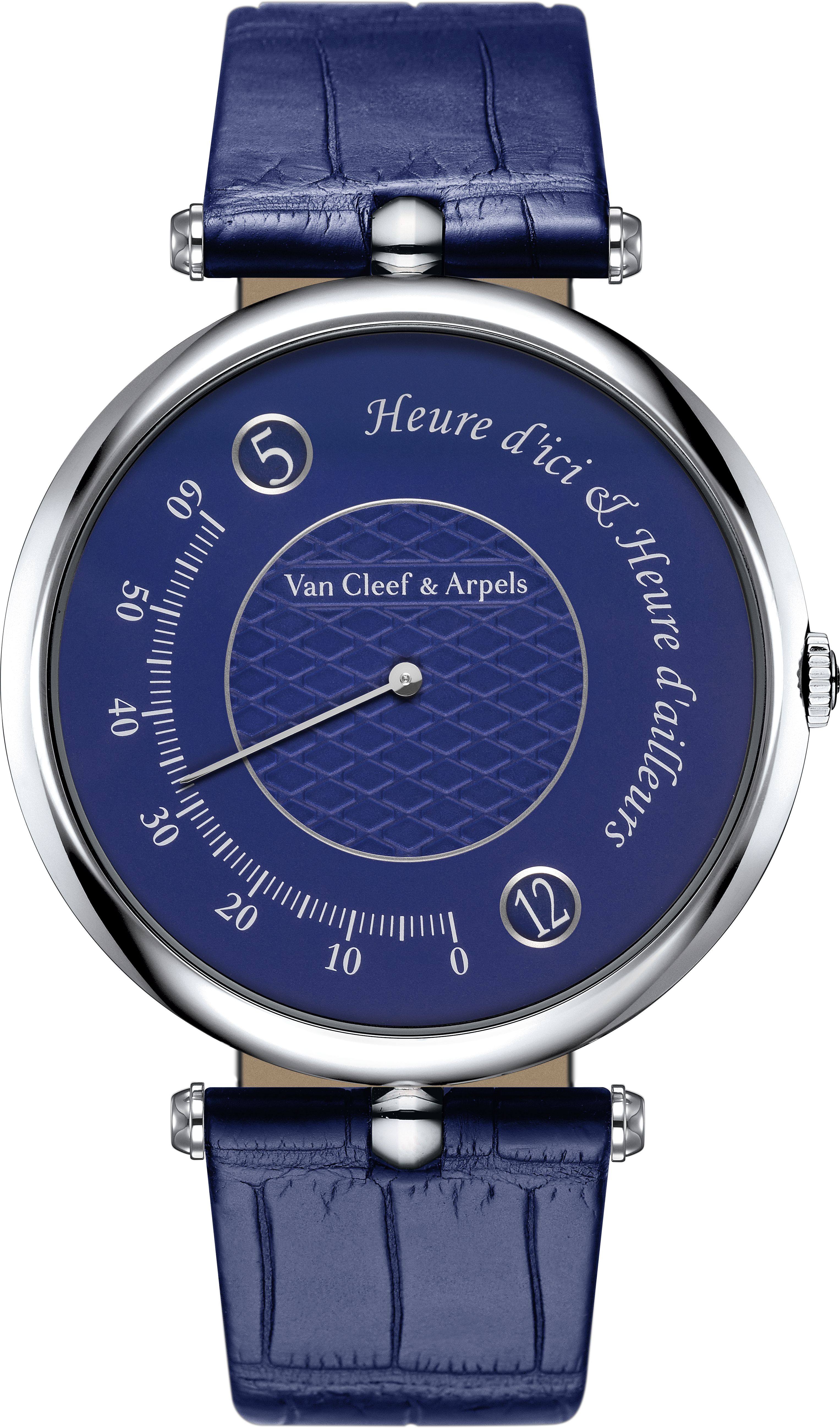 Il nome di questo saltarello automatico con doppio fuso orario, realizzato per Only Watch è infatti, Heures d’ici et Heures d’ailleurs. Il fondo blu del quadrante, lavorato a piqué, invita a un viaggio verso il Principato di Monaco e il suo mare, cullati dal movimento del microtore in platino decorato anch’esso piqué, che si ammira dal fondo in vetro zaffiro. Sotto il profilo tecnico il movimento, sviluppato da Agenhor e riservato in esclusiva a Van Cleef&Arpels, ha le ore saltanti e i minuti a retrograde che si accompagnano alla raffinata eleganza del modello con cassa in oro bianco ø 42 mm, e corona in oro impreziosita d un diamante rotondo.