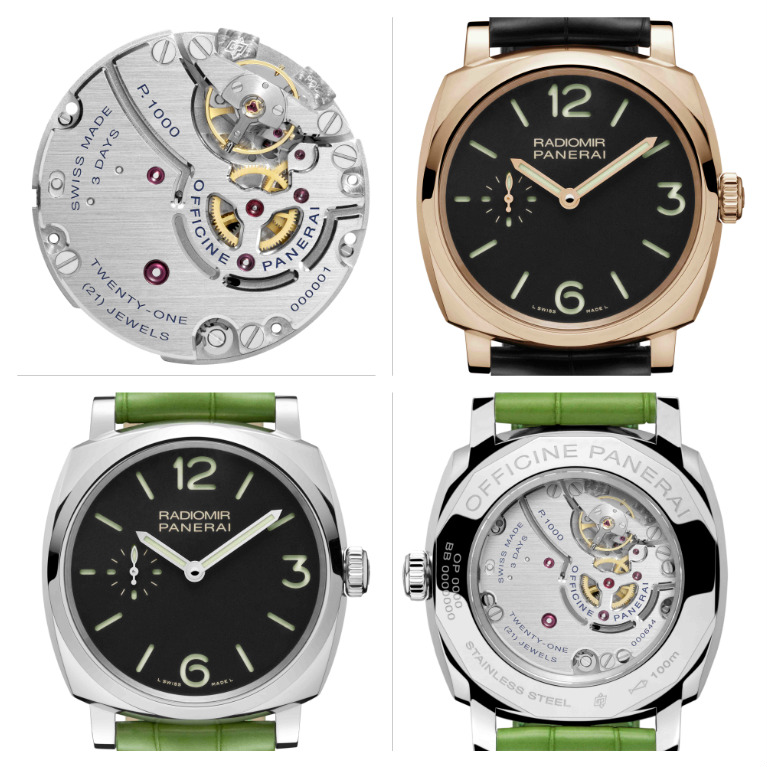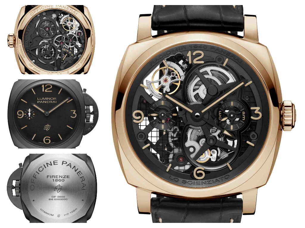 In pole-position i Radiomir 1949: un carica manuale 3 gg di carica con il nuovo Calibro P.1000 d Manifattura, un automatico Calibro P.4000 con 10 gg di carica, entrambi in cassa ø 42 mm in acciaio o in oro rosso, un GMT 10 gg di carica automatico Calibro P.2003/10 in oro rosso con quadranti marrone o nero, cassa ø 45 mm e un nuovo Scienziato GMT dedicato a Galileo, cassa ø 48 mm in oro rosso, movimento manuale Calibro P.2005/S e scappamento a tourbillon.