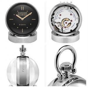 In edizione limitata a 300 esemplari il Luminor 1950 Special Edition in titanio DLC, cassa ø mm 47, movimento manuale P.3000 e infine (mancava) un orologio da scrivania, non tutti infatti amano le pendole e questo table clock carica manuale 8 gg dal design originale, racchiuso in una sfera di vetro minerale e con due tipi di quadrante , è perfetto per un manager.