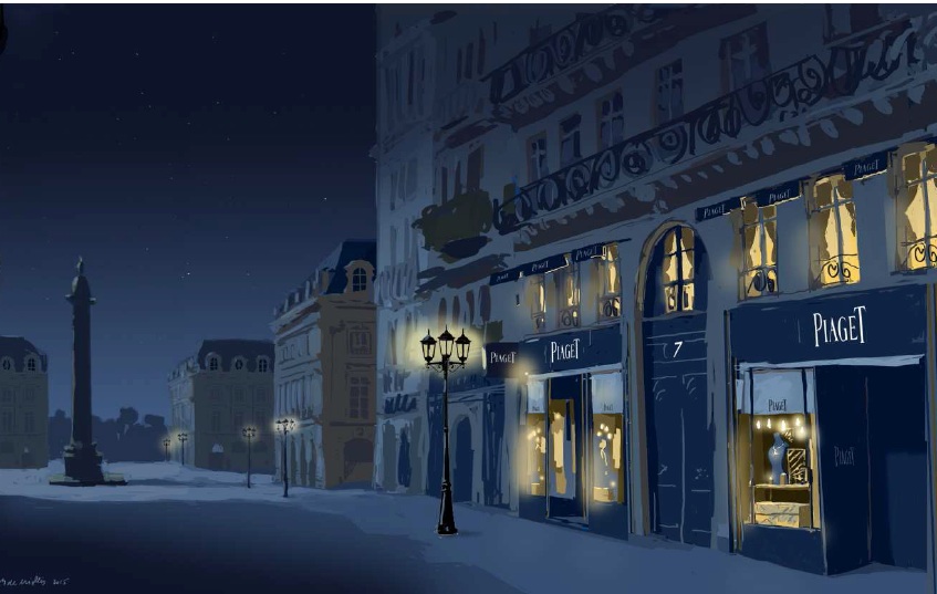 Within some days Piaget will open its biggest flagship in Rue de la Paix 7 Paris, with more than 500 sq.m. over two floors, for high jewellery and watches.In attesa delle fotografie ufficiali, pubblichiamo il dipinto di Bertrand de Miollis che ha creato una magìa notturna con lo sfondo di place Vendôme.