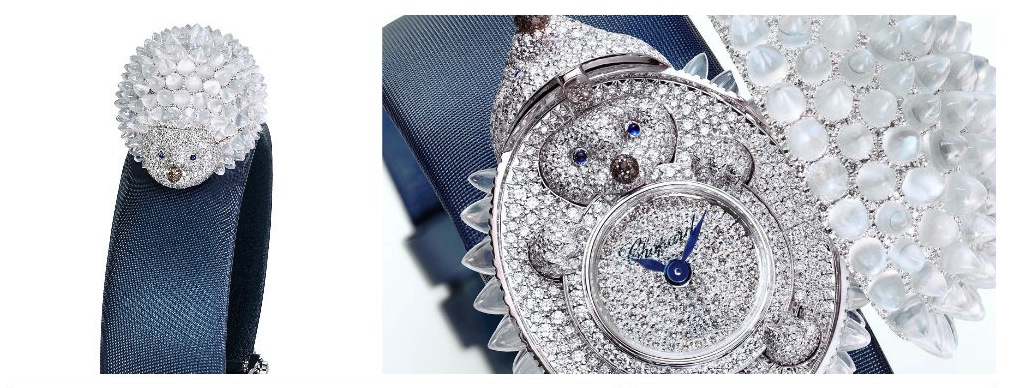 Con un paziente lavoro di centinaia di ore i maestri gioillieri hanno incastonato nell’oro bianco con tecniche particolari le pietre preziose, ottenendone il giusto volume per il corpo di un riccio “unico” e luminoso; la testa ha diamanti a pavé per oltre 4 carati, gli occhi sono due zaffiri, il naso è realizzato con diamanti brown, toccandolo sulla testa la parte superiore del corpo si apre e svela l’orologio segreto adagiato tra le zampe di un altro riccio ancora cucciolo; l’interno di questa culla è impreziosito con altri diamanti. Siamo di fronte a un pezzo unico della colleione d’alta gioielleria Animal World, che mostra l’abilità di tutti i Maestri dei Mestieri d’Arte che fanno parte della Manifattura ginevrina.