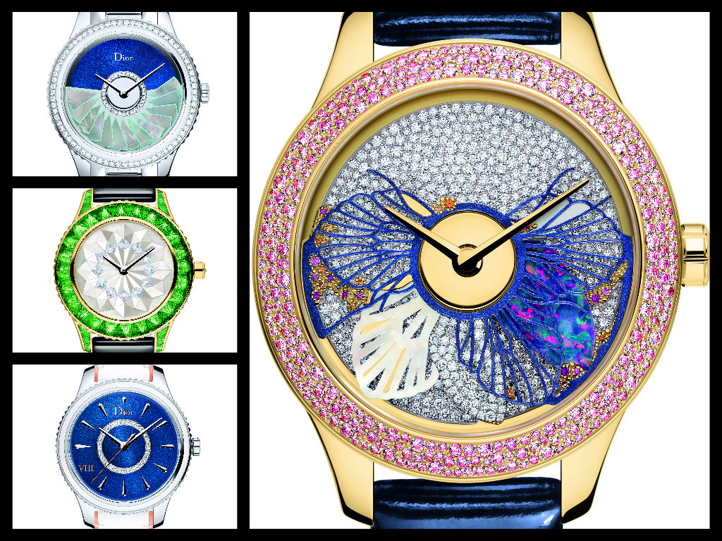 A questo pezzo unico di Dior Horlogerie, si affiancano altri orologi da sogno come il Plissé Soleil (888 esemplari in acciaio e diamanti) o le nuove cinque versioni del Dior Grand Soir, in oro, ø 33 mm e movimento automatico Made in Swiss, dedicato agli Origami; nelle creazioni giapponesi le superfici di carta riflettono la luce, qui lo stesso effetto è ottenuto con pietre preziose su quadrante e lunetta. Infine le versioni primaverili 2015 al quarzo Made in Swiss, cassa in acciaio ø 32 mm e diamanti, quadrante bianco o laccato blu.