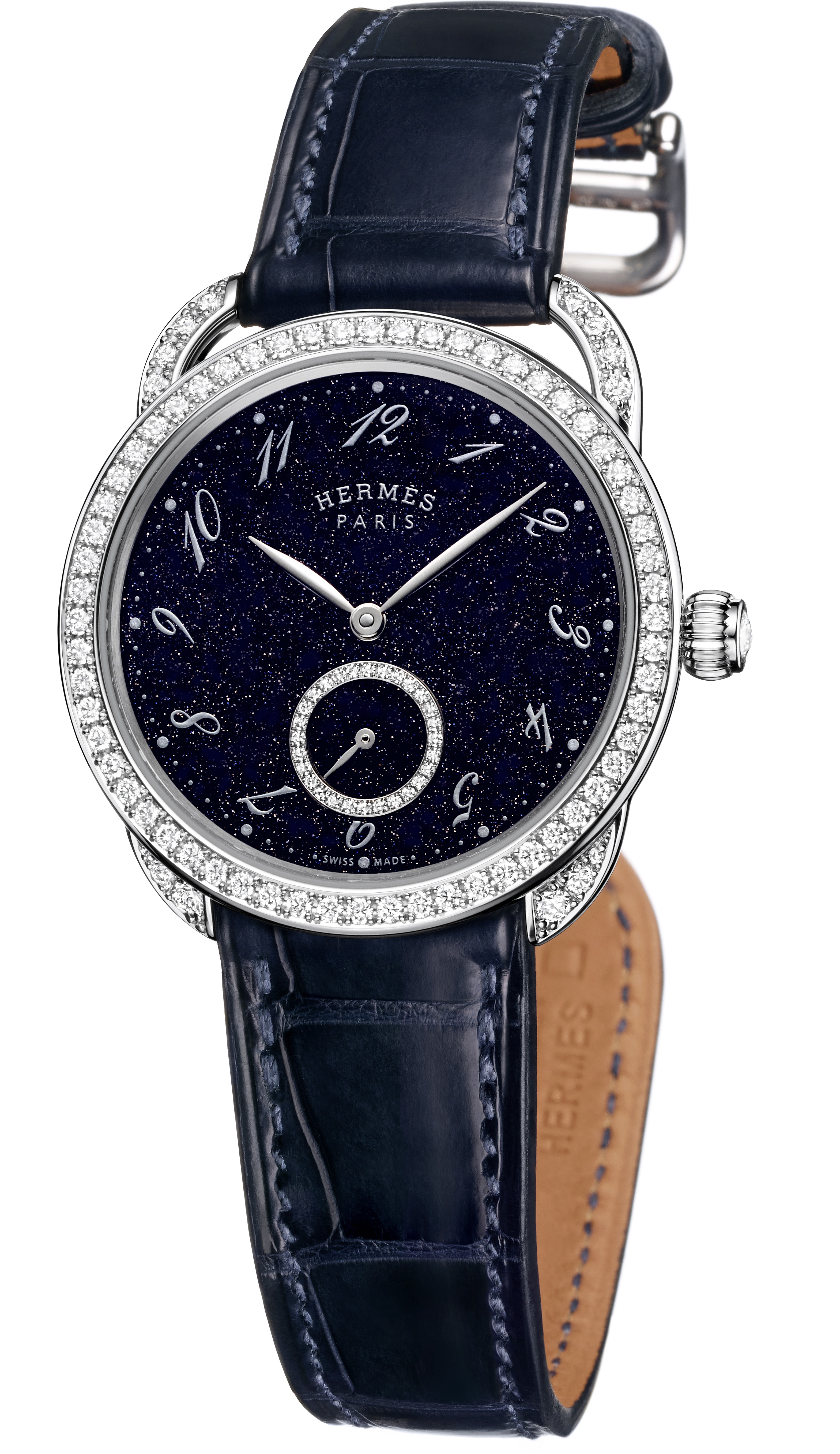 La cassa in oro ø 34 mm (diamanti per c.ca un carato incastonati anche su anse e corona) accoglie un movimento di Manifattura Hermès a carica automatica H1912 (con precisazione “fabbricato in Svizzera” sempre utile anche se chi segue Hermès dovrebbe sapere che La Montre Hermès ha il suo stabilimento nella Confederazione e una consistente partecipazione in Vaucher a Fleurier); le A/h sono 28.800, i rubini 28, decorazione perlata e spiraliforme, ponti e massa oscillante satinati e con motivo a H, la massa oscillante è rodiata. Il quadrante blu in avventurina incastona 28 diamanti, un decalco in polvere argentata rende la superficie simile a un cielo stellato. Il cinturino è in alligatore mat indaco.