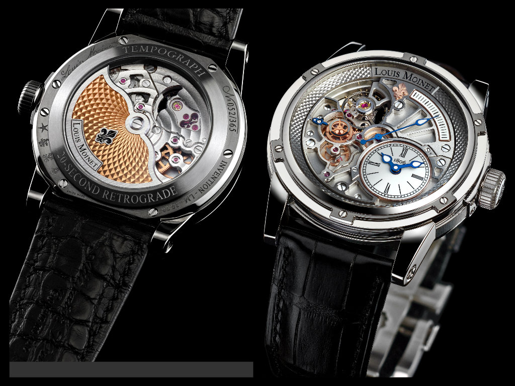 Al Palace Louis Moinet esporrà anche le versioni del cronografo, invenzione a lungo attribuita a Rieussec; primati a parte, ricordiamo agli appassionati il 20 second retrograde TempoGraf automatico, realizzato l’anno scorso e che in oro bianco o oro rosa (60 esemplari) e in titanio (365 esemplari) segue la versione a 1o secondi.