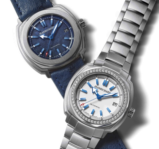 Nella collezione Terrascope l’anteprima è composta da due modelli, uno con cinturino in struzzo e uno con bracciale in acciaio, entrambi con la cassa, ø 39 mm, che unisce la forma coussin a quella tonda della lunetta. Elemento distintivo del 2015 la scelta del colore blu per il quadrante nella versione con cinturino in pelle e solo per gli indici su quadrante bianco per quella con il bracciale. Quest’ultimo ci sorprende perché incastona nella lunetta 64 diamanti, dettaglio lussuoso in un segnatempo che ci sembra dichiaratamente sportivo. In entrambi movimenti automatici, A/h 28.800, 26 rubini, massa oscillante con il logo JR visibile dal fondello in vetro zaffiro.