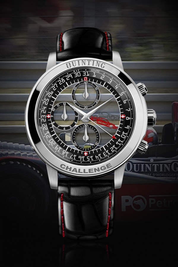 Quinting has made a chronograph for Le Mans (24 pieces), but it’s very amazing Race Challenge with two cars running on the dial; 60 pieces and in every one the race starts in the minute of the numbered edition.