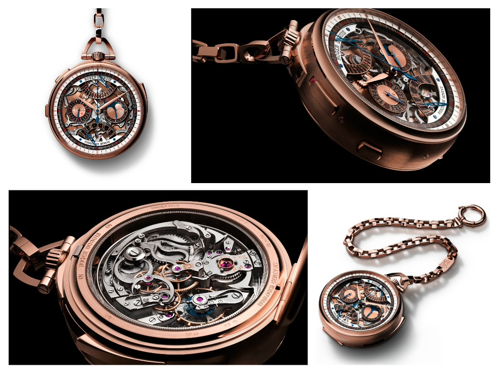 L’Hommage in oro rosa, ø 60 mm, completato da una catena d’oro e con fondello in vetro zaffiro; è un Gran Complicato, è un ripetizione minuti, cronografo e calendario perpetuo con indicazione del quadriennio; sul quadrante le fasi di luna sono in lapislazzuli, la luna è in oro rosa; data e giorni della setimana sono indicati a retrograde, il movimento è il Calibro RD181 a carica manuale e come tutta la produzione RD ha il Punzone di Ginevra.