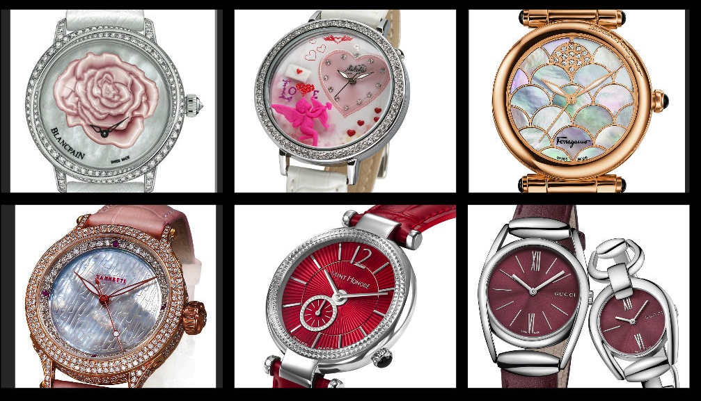 2015 San Valentino: sopra proposte di Blancpain, Didofà e Ferragamo; qui Zannetti Regent Lady gioielleria, St:Honoré Audacy e la coppia dei Gucci Time Horsebit