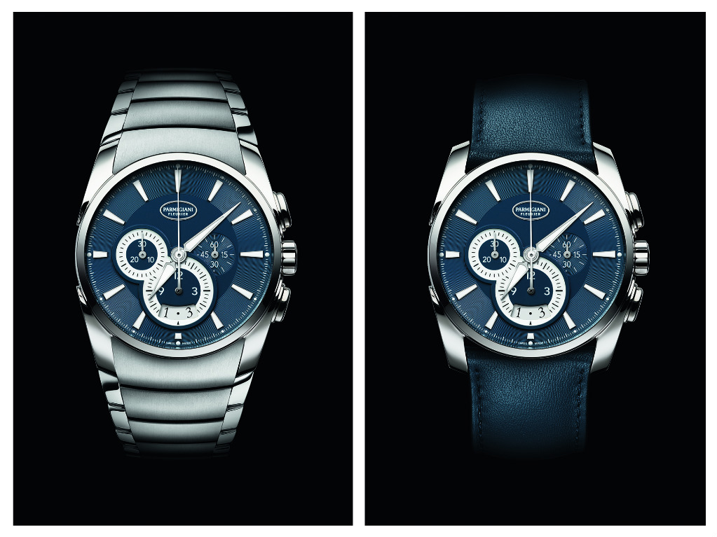 IL Metrograph è un cronografo automatico con movimento di Manifattura, il Calibro 12”’1/2 PF315 ideato e realizzato nella Vaucher Manufacture Fleurier con A/h 28.800 o 4 Hz, 46 rubini, 315 componenti, 2 bariletti in serie, bilanciere a inerzia variabile. In acciaio la cassa ø 40 mm Tonda, che nel 2014 venne presentata con un’originale asimmetria curvilinea fra il lato a sinistra a goccia e quello a destra che si fonde con le anse allungate, ed è speciale il colore del quadrante. Per arrivare al colore Abissi la tonalità è quella delle immagini scattate a Chicago e sul lago Michigan da un bravo fotografo, mentre in Svizzera la sfumatura nasce dal trattamento galvanico sulla superficie del quadrante in nichel. Negli stabilimenti Parmigiani il colore passa dall’arancione al marrone, al violaceo delle melanzane e poi a un blu viola che al momento giusto diventa il blu Abissi quando l’operazione viene terminata per non sconfinare in altri blu arrivando sino al grigio. A questo punto sul finissage con motivo a chiocciola sulla parte esterna e opalino al centro, entra in gioco un’altra scelta estetica: il profilo dei contatori di ore e minuti è bianco luminescente formando, sullo sfondo blu, un 8, cifra emblematica per Parmigiani.