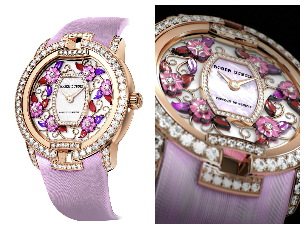 Sono orologi destinati a una ristretta élite, non tanto di gusto quando di disponibilità economiche, ma sono anche l’espressione della grande abilità degli artigiani artisti, siano essi gioiellieri o maestri incisori che lavorano nella Marca ginevrina, senza dimenticare i Maestri orologiai che hanno inserito in questa collezione appositi movimenti meccanici. L’automatico Velvet Blossom Rose ø 36 mm in oro rosa contorna il motivo ovale del quadrante con fiori di diversi colori (gli altri saranno presentati a Ginevra) nati in un consistente spessore di smalto grand Feu, al centro di ogni fiore scintilla un diamante con una montatura d’oro e non con le tradizionali griffe. Nel Diamond Heart in oro bianco e diamanti, la data saltante biretrograde porta una piccola complicazione meccanica sul quadrante, il movimento è il Calibro automatico RDB821