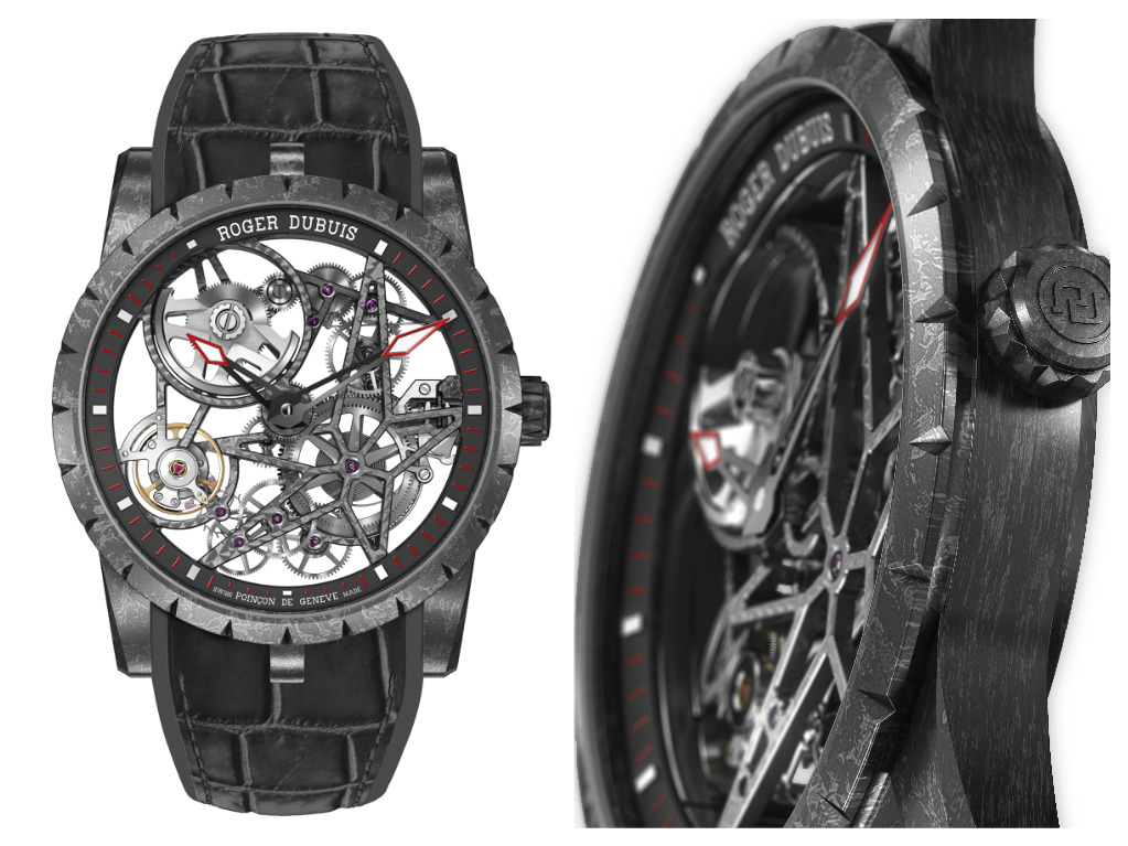 Per il pubblico maschile invece l’Excalibur automatico squelette, presentato nel gennaio 2015, diventa più attuale con l’impiego di una superficie in SMC fibre di carbonio pressate con resina e acciaio, che dona alla struttura della cassa ø 42 mm ricoperta, un aspetto molto sportivo; anche in questa versione il movimento dell’Excalibur, Calibro RD820SQ con micromotore, non ha lo scappamento a tourbillon. Tutti questi orologi recano, come d’altronde l’intera produzioen Roger Dubuis, il Punzone di Ginevra.