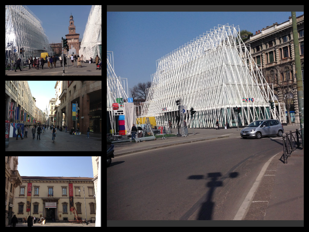 Gli orologi count-down di Swatch hanno ritmato l’attesa di molti grandi eventi sportivi e sono stati inaugurati in tutto il mondo, fra 48 ore anche Milano ne avrà uno, in largo Cairoli di fronte al Castello, dove dal maggio 2014 sono state montate le due strutture che incorniciano la Torre del Filarete. Il progetto architettonico trasparente e modulare di Alessandro Scandurra, è un immaginario cancello cittadino da attraversare prima di prendere la metropolitana rossa per arrivare all’Expo. A sinistra nella foto, sopra, altri scorci milanesi, il castello Sforzesco, Corso Vittorio Emanuele con le bandiere delle nazioni espositrici (installate anche nelle vie che uniscono piazza del Duomo a largo Cairoli) e sullo sfondo la Madonnina, infine la Biblioteca Pinacoteca Accademia Ambrosiana, che accoglie a breve una splendida mostra dedicata a Leonardo e che da aprile avrà anche una rassegna culturale dedicata all’orologeria elvetica.