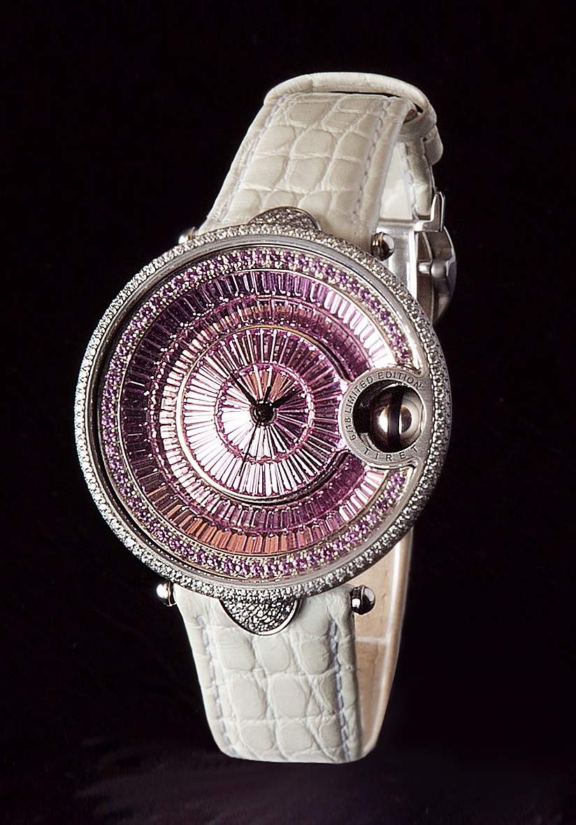 Quest’anno le collezioni Tiret, molte quelle in tiratura limitata, erano a Basilea, nell’ambito della Mostra Swiss Creative Lab all’hotel Ramada, dove molte Maison sono in attesa di poter avere accesso alle Hallen di Baselworld. Tipiche dei Tiret le forme ellittiche delle casse. Di recente questi segnatempo sono stati ammirati al polso di VIP americani, da Donald Trump al rapper Usher, o australiani come la modella Elle MacPherson. In Europa sono reperibili in ricercatissimi punti vendita a Monte-Carlo, Cannes, Londra, Ginevra o Mosca. Anche se il modello più – permetteteci – “popolare” è il Second Chance (in apertura) che nella cassa ovale in acciaio mm 56×45 accoglie più movimenti automatici o al quarzo; a noi – e non poteva essere altrimenti – è piaciuto soprattutto il Tourbillon Parquet, un pezzo unico con movimento del Maître Horloger Antoine Preziuso nella cassa in oro bianco, ø 42 mm, con preziosi diamanti baguette a incastonatura invisibile; il modello deve il nome alla decorazione particolare del quadrante. Sempre nel campo degli orologi gioiello anche il Bleeding Heart con cassa ø 42 mm in acciaio impreziosita con diamanti o zaffiri di vario colore che, a centinaia, sono incastonati anche sul bracciale; il movimento è il Calibro ETA 2671 modificato per Tiret. Infine il Classiq in acciaio ø 43 mm e fondo in vetro zaffiro, è equipaggiato con il Calibro ETA 2897 con indicazione della riserva di carica. (Lorenzo Sutti)