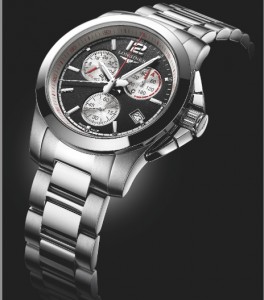 A new quartz Conquest for equestrian jumping: steel case ø 41 mm, on the black or silver dial a red hand shows 1/100″ on the flange, at 10 o’clock a counter for faults and penalties and at 2 a 45 second scale for count-down after the bell has been rung for competitor’s round.