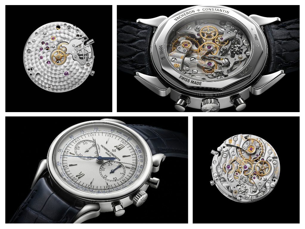 Poi torniamo agli anni Cinquanta e a un cronografo Vacheron Constantin, il primo a tenuta stagna e antimagnetico; quello attuale ne riprende elementi salienti, ma il movimento di Manifattura è il nuovo Calibro 1142 a carica manuale, 164 elementi, 21 rubini, 21.600 A/h, con ruota a colonne la cui vite è a forma di croce di Malta simbolo della Marca. La cassa ø 38,50 mm è in platino mentre l’originale del passato era in oro giallo e aveva un diametro di 35 mm (misura che oggi a malapena viene impiegata nei modelli da donna), la protezione antimagnetismo era una leggera cassa interna in ferro dolce.