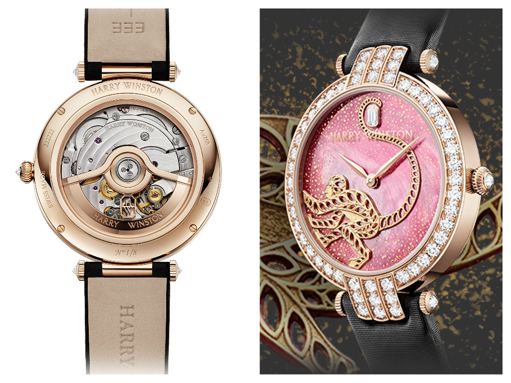 L’automatico ideato dai Maestri di Harry Winston è un orologio civettuolo con una scimmietta che sembra quasi voler uscire dal quadrante in madreperla rosa tra un cascata di paillettes d’oro. Incisa in oro e con un occhio in diamante la scimmia si aggrappa alla lunetta impreziosita come le anse con 74 diamanti per quasi 2,5 carati, mentre la coda si avvolge maliziosamente, quasi a dondolarsi, sul diamante incastonato a ore 12. La cassa di questo orologio, ø 36 mm è in oro rosa, dal fondo in vetro zaffiro si vede il movimento automatico con la tradizione decorazione dell’alta orologeria e con la spirale piatta in silicio. L’edizione è limitata a otto esemplari.