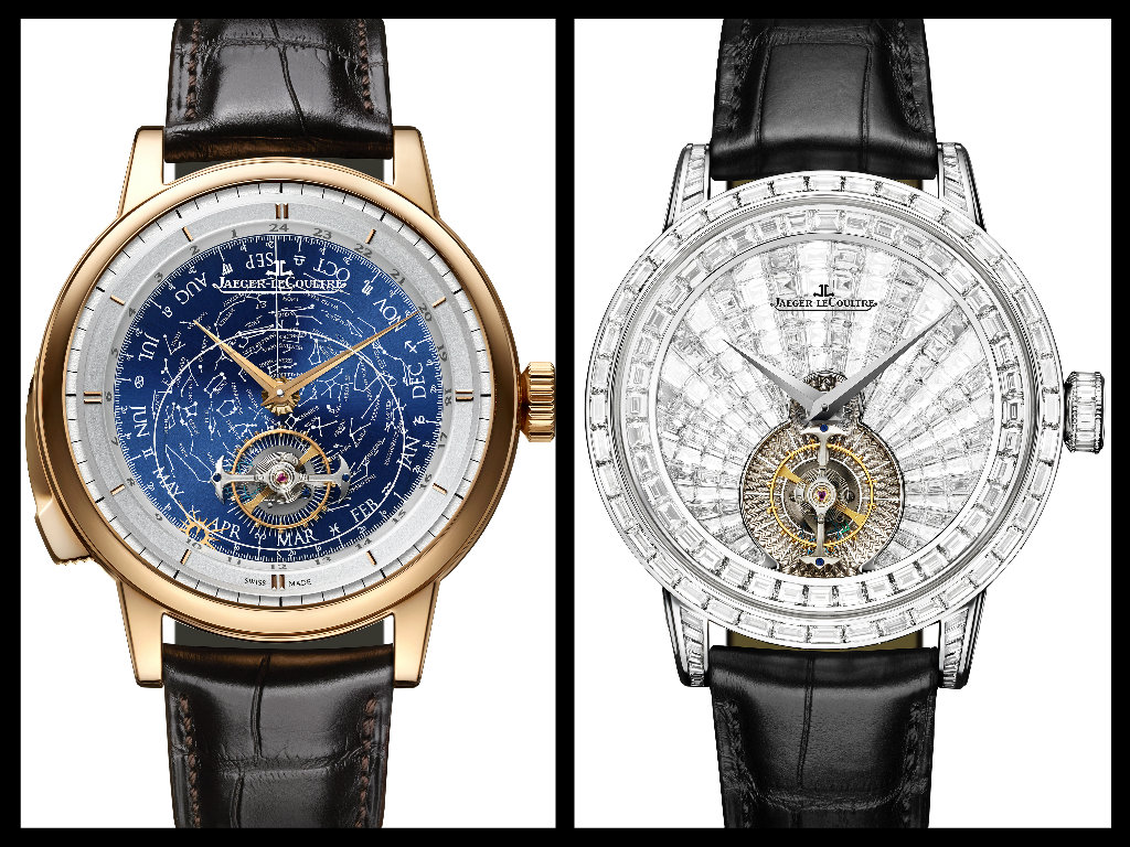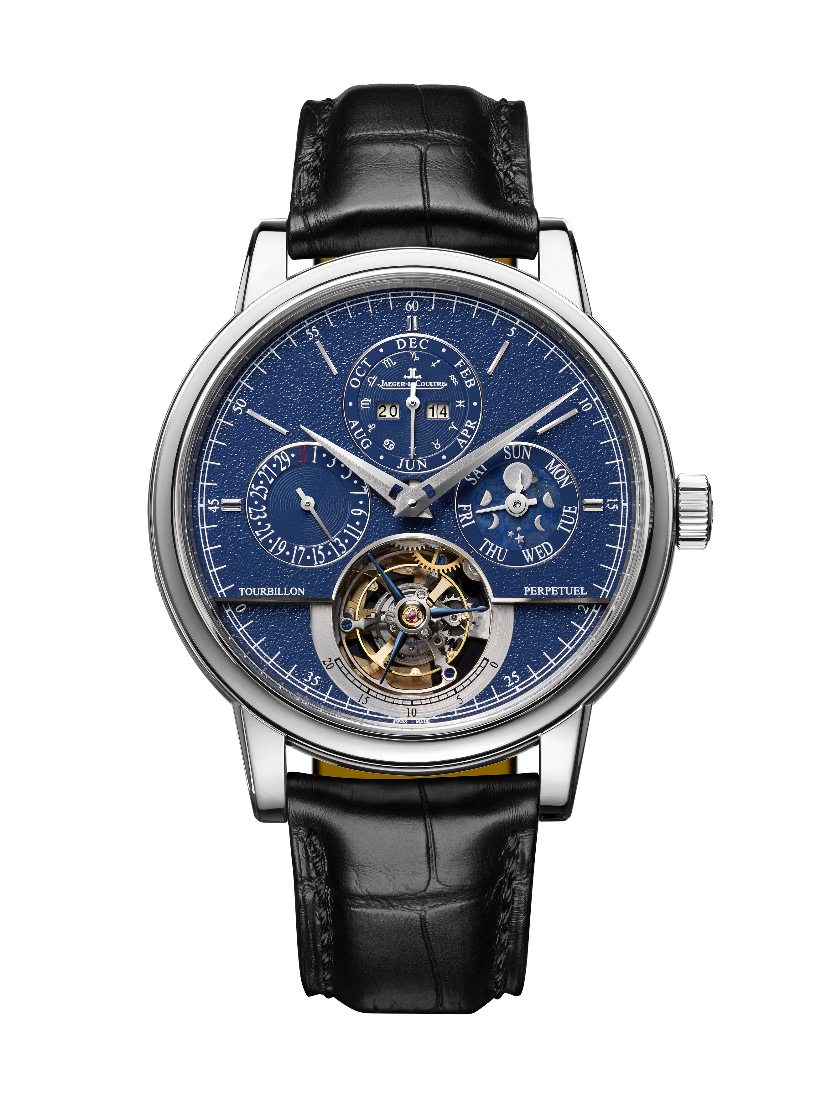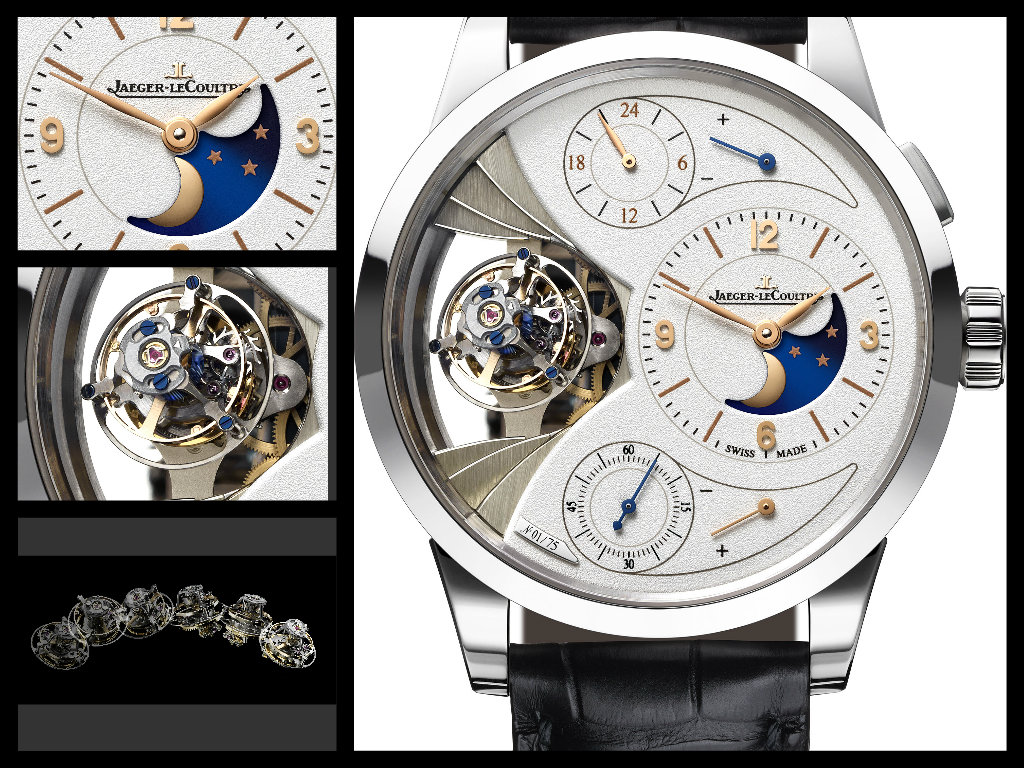 Il Master Grande Tradition Grande Complication è un carica manuale, Calibro JLC945 (527 componenti, 49 rubini) con queste funzioni: ore e minuti, Tourbillon volante e orbitale e carta celeste dell’emisfero nord; Ripetizione minuti con timbri in cristallo cattedrale e martelli a trébuchet per ottenere la migliore sonorità; zodiaco, mese e indicazione delle 24 ore. La cassa è in oro rosa ø 45 mm, sul quadrante blu satinato, con anello argentato opalino, si notano le costellazioni. Un piccolo sole ruota sul quadrante esattamente in 24 ore indicando i segni dello zodiaco, i mesi e i giorni su una scala circolare sul bordo. Infine il tourbillon volante, che riproduce il movimento della terra nel giorno siderale (23 ore, 56 minuti e 4 secondi), è un indicatore delle ore, si sposta lentamente in senso antiorario attorno al quadrante al quale è fissato; leggerissima la gabbia in titanio.