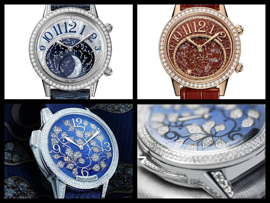 Destinato a polsi femminili in Rende-Vous con la luna accentua, con il grande arco in madreperla sul quadrante, l’importanza di questo astro. La precisione dell’indicazione è garantita per 972 anni. La cassa è prevista in due versioni, una ø 39 mm impreziosita con 208 brillanti, l’altra ø 36 mm ne incastona 166. Per entrambe movimento automatico di Manifattura JLC Calibro 935, 28.800 A/h e 41 rubini; Due le corone, a ore 2 per l’indicatore dell’appuntamento e a ore 4 per regolare l’ora e le fasi lunari. Sempre in una cassa ø 39 mm persino l’automatico Ripetrizione Minuti che elimina i rumori di sottofondo per migliorare la sonorità dei gong; il movimento è il Calibro JLC 942A; sul quadrante tipo Florale, su cassa e anse 549 diamanti. Parlando di precisione non possiamo poi dimenticare l’automatico Geophysic 1958, disponibile in acciaio (800 esemplari) e in oro rosa (300); i 58 in platino sono acquistabili solo nelle boutique della Marca.